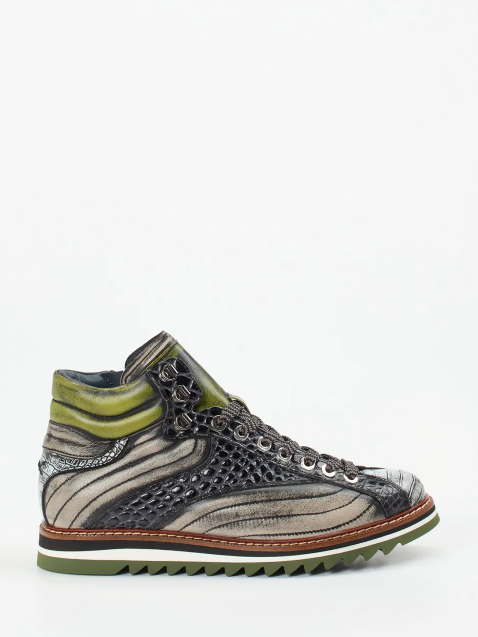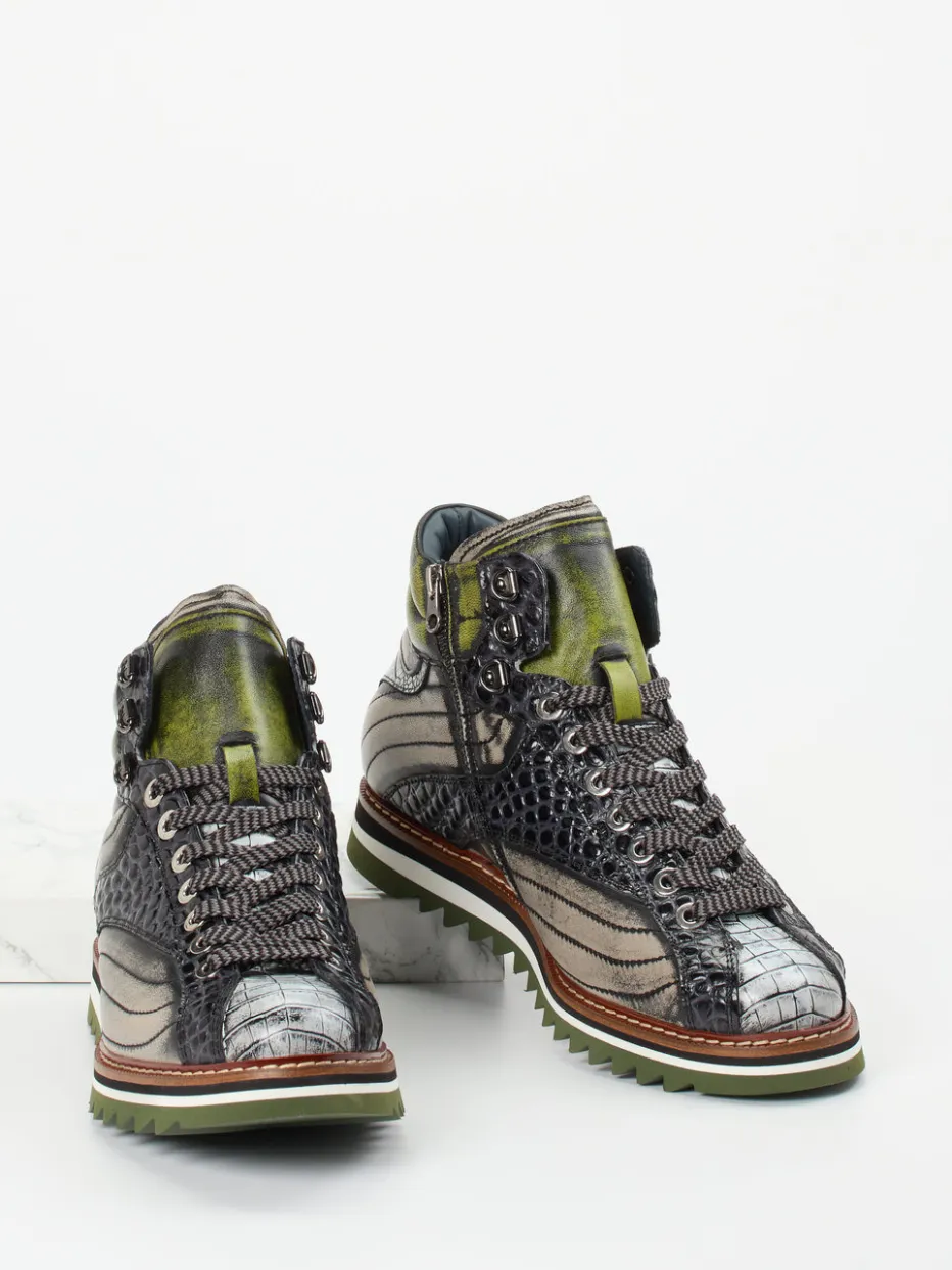 Stilvoller Auftritt mit Outdoor-Charakter.Die Marke Konstantin Starke präsentiert einen ausdrucksstarken Fashion-Hiker innerhalb der Kategorie Schnürboots. Ideal für modische City-Touren mit sportivem Touch: Der Stiefel kombiniert geprägtes Leder in Kroko-Optik mit einer glänzenden Oberfläche und kontrastierenden Farbverläufen in Anthrazitgrau, Olivgrün und Silbergrau. Das metallisch akzentuierte Design wird durch eine markante Schnürung mit silberfarbenen Bergsteigerösen und gepolstertem Schaft ergänzt. Die mehrschichtige Gummisohle mit Zickzack-Profil verleiht dem Modell einen robusten Urban-Hiking-Charakter. Gorpcore-inspirierte Details und Streetwear-Elemente treffen in diesem Design aufeinander. Lässt sich ideal mit technischen Outdoor-Materialien und Statement-Jacken kombinieren. Ein Unisex-Boots für progressive Looks mit luxuriösem Finish.
