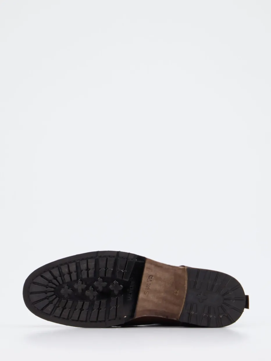 Stilvoll durch Alltag und Gelände. Die Marke Shoto präsentiert mit diesen Schnürboots ein maskulines Statement für stilvolle Abenteurer. Gefertigt aus dunkelbraunem Kalbleder mit genarbter Oberfläche, vereinen sie funktionale Robustheit und modische Substanz. Die klassische, knöchelhohe Silhouette wird durch messingfarbene Metallösen, eine abgedunkelte Schuhspitze und die profilierte Vibram-Gummisohle ergänzt. Ob bei Freizeitaktivitäten oder Stadtausflügen – der Heritage-Look mit Workwear-Anklängen passt zum aktuellen „Quiet Utility“-Trend. Kombiniert mit Jeans und Cargojacke entsteht ein souverän-lässiger Auftritt. Mit langlebiger Verarbeitung und authentischem Vintage-Charakter steht Shoto für kompromisslosen Stil.