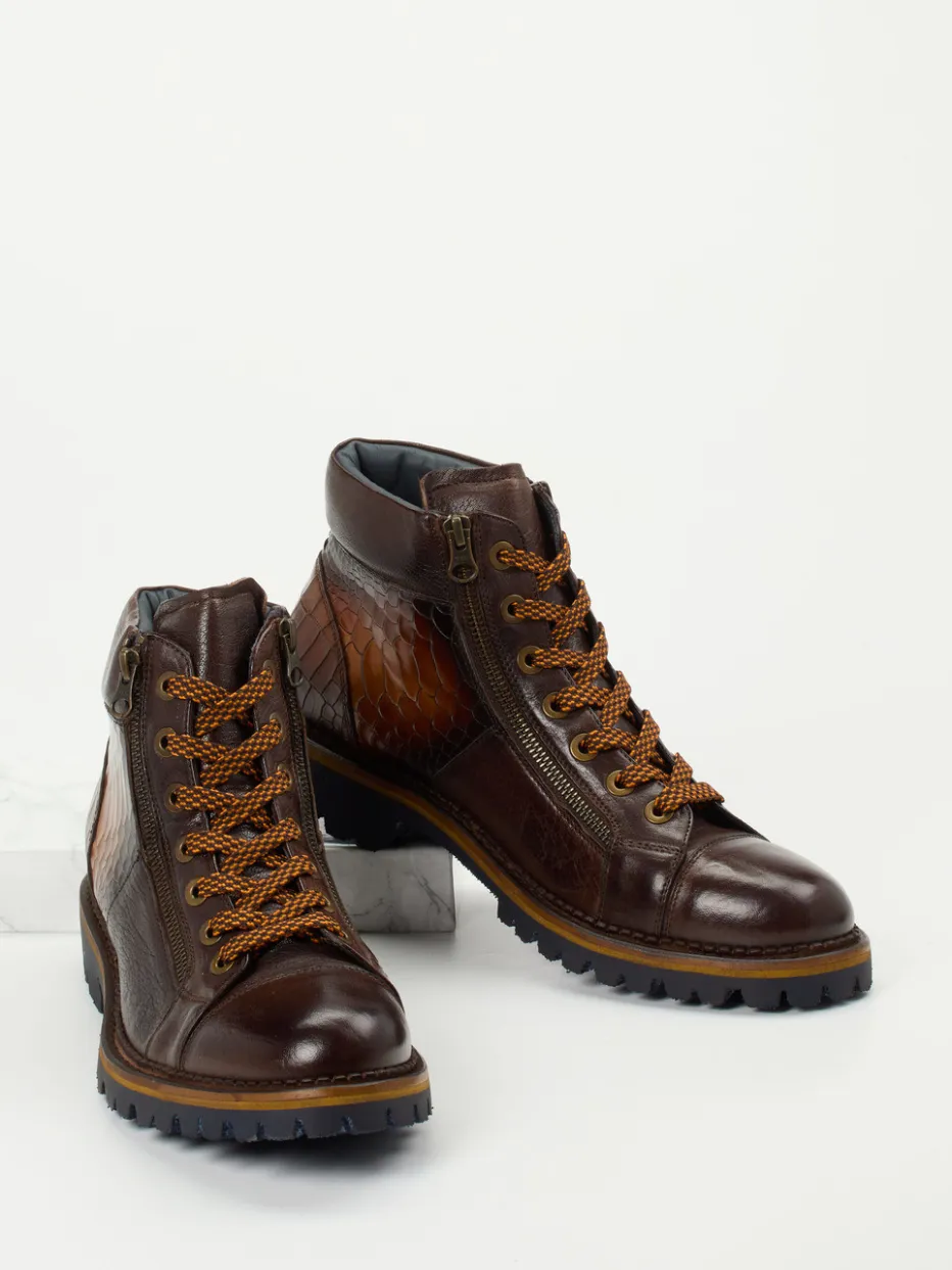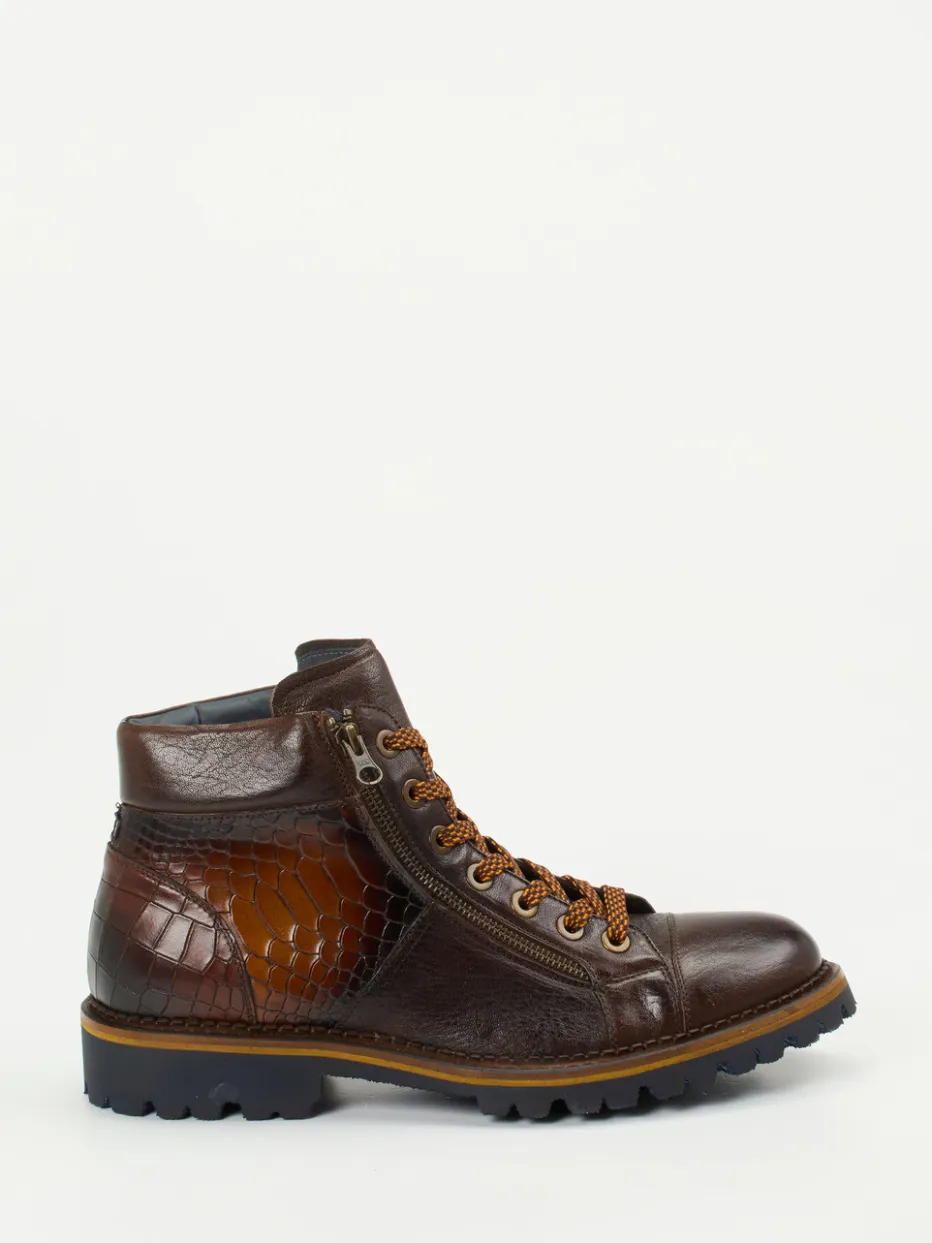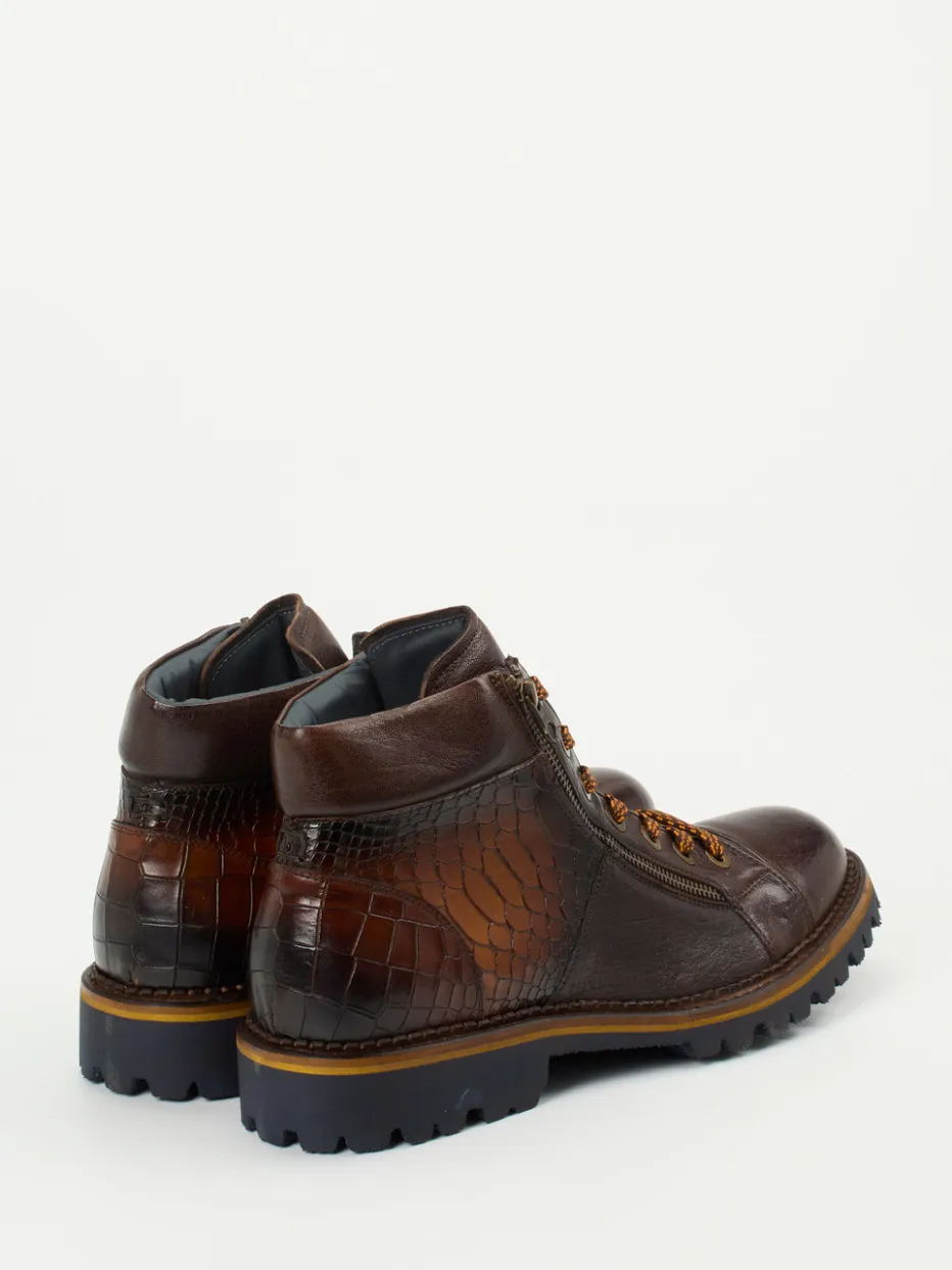 Stilsicher durch Wind und Wetter.Konstantin Starke präsentiert hier modische Herren-Schnürboots mit durchdachtem Outdoor-Charakter. Für herbstliche City-Touren oder entspannte Wochenenden im Freien punkten diese knöchelhohen Boots mit dunkelbraunem Kalbleder und glänzender Krokoprägung im Fersenbereich. Die Kombination aus seitlichen Reißverschlüssen und zweifarbigen Schnürbändern erleichtert den Einstieg und setzt stilvolle Akzente. Ein weich gepolsterter Schaft und Innenfutter aus feinem Leder sorgen für angenehmen Tragekomfort, während die robuste Gummisohle mit blauem Profil sicheren Halt garantiert. Vintage-Referenzen verbinden sich mit moderner Streetwear und machen dieses Modell zu einem spannenden Struktur-Mix. Ein gehobener Casual-Schuh mit markanter Optik und funktionalem Kern.