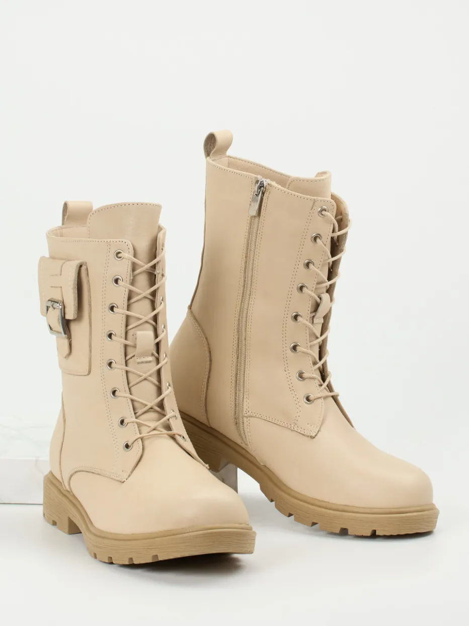 Beige Schnürboots mit robuster Profilsohle und praktischer Mini-Tasche – stilvoll interpretiert im Utility-Trend für moderne Alltagslooks.