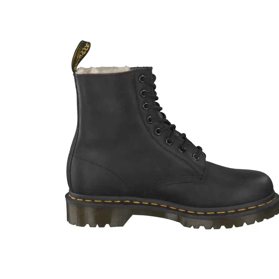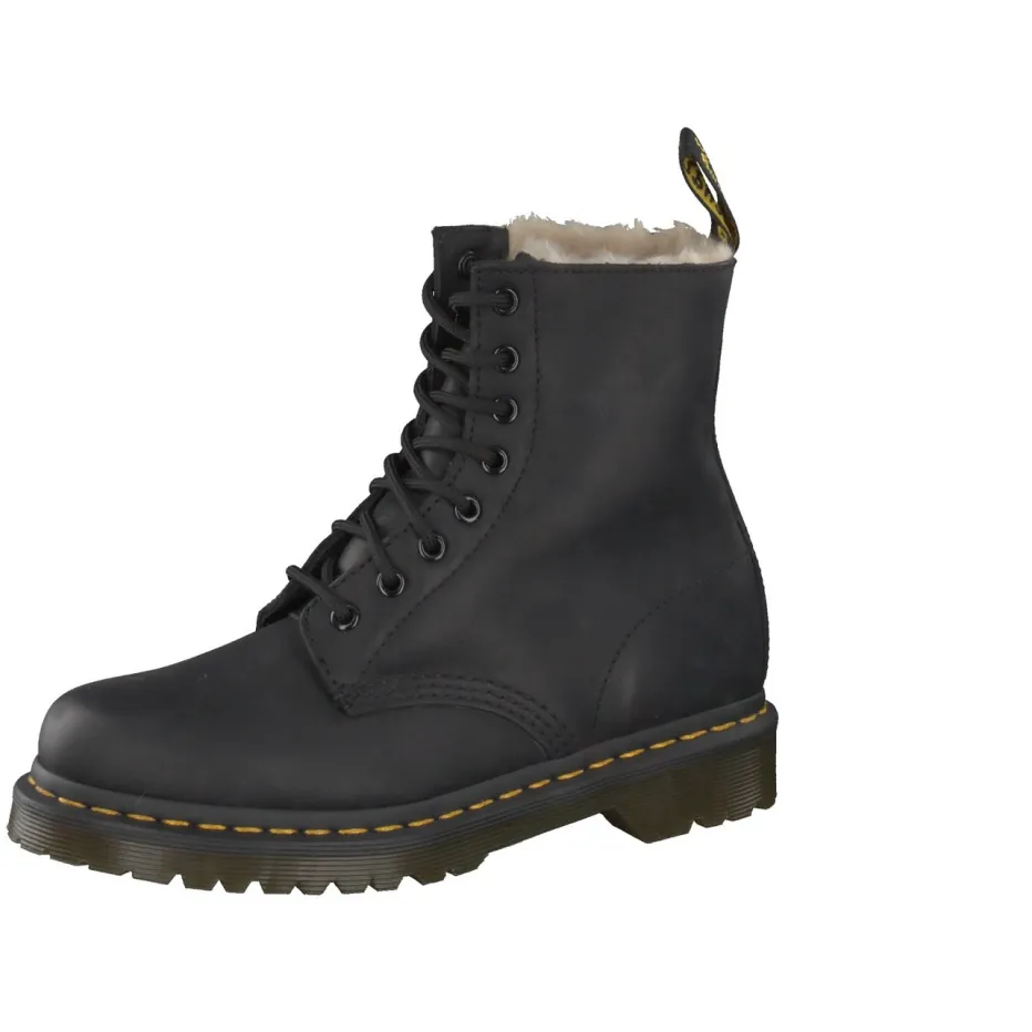 Robust durch den Winter.Dr. Martens erweitert die Damenlinie um gefütterte Schnürboots in ikonischer Optik. Für nasskalte Tage bietet das robust genarbte Kalbleder mit Fettoberfläche zuverlässigen Schutz und Langlebigkeit. Das nachtschwarze Finish wird durch gelbe Kontrastnähte und eine markante Profilsohle akzentuiert. Das farblich abgestimmte Kunstfell-Innenfutter sorgt für angenehme Wärme. Der klassische High-Top-Cut, die markentypische Zuglasche und die rutschfeste Airwair-Sohle betonen den Utility-Charakter mit Streetstyle-Attitüde. Ideal für urbane Outfits mit Oversized-Winterjacken oder Thermo-Leggings. Ein unverkennbares Staple für stilbewusste Alltagstauglichkeit mit Subkultur-Flair.
