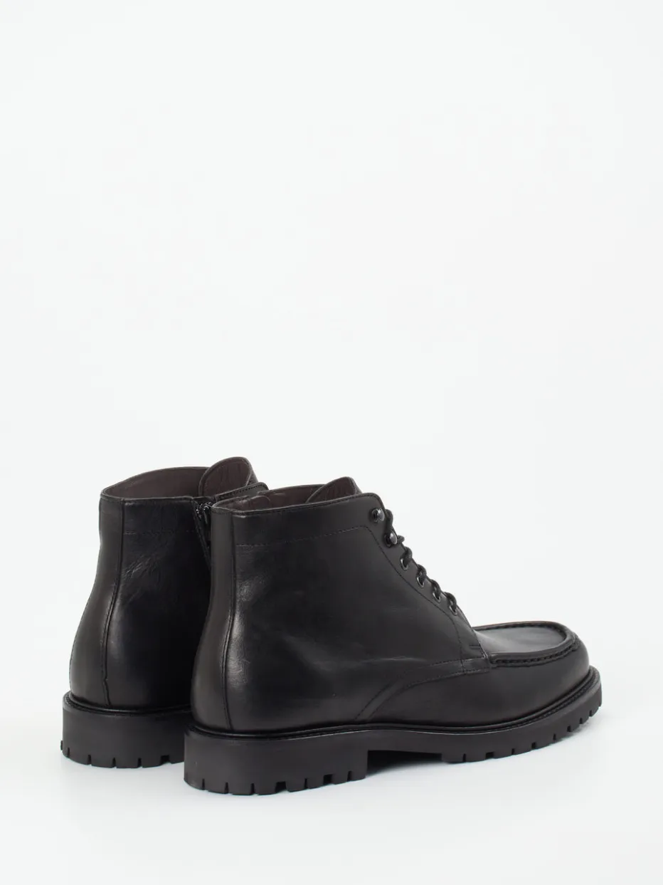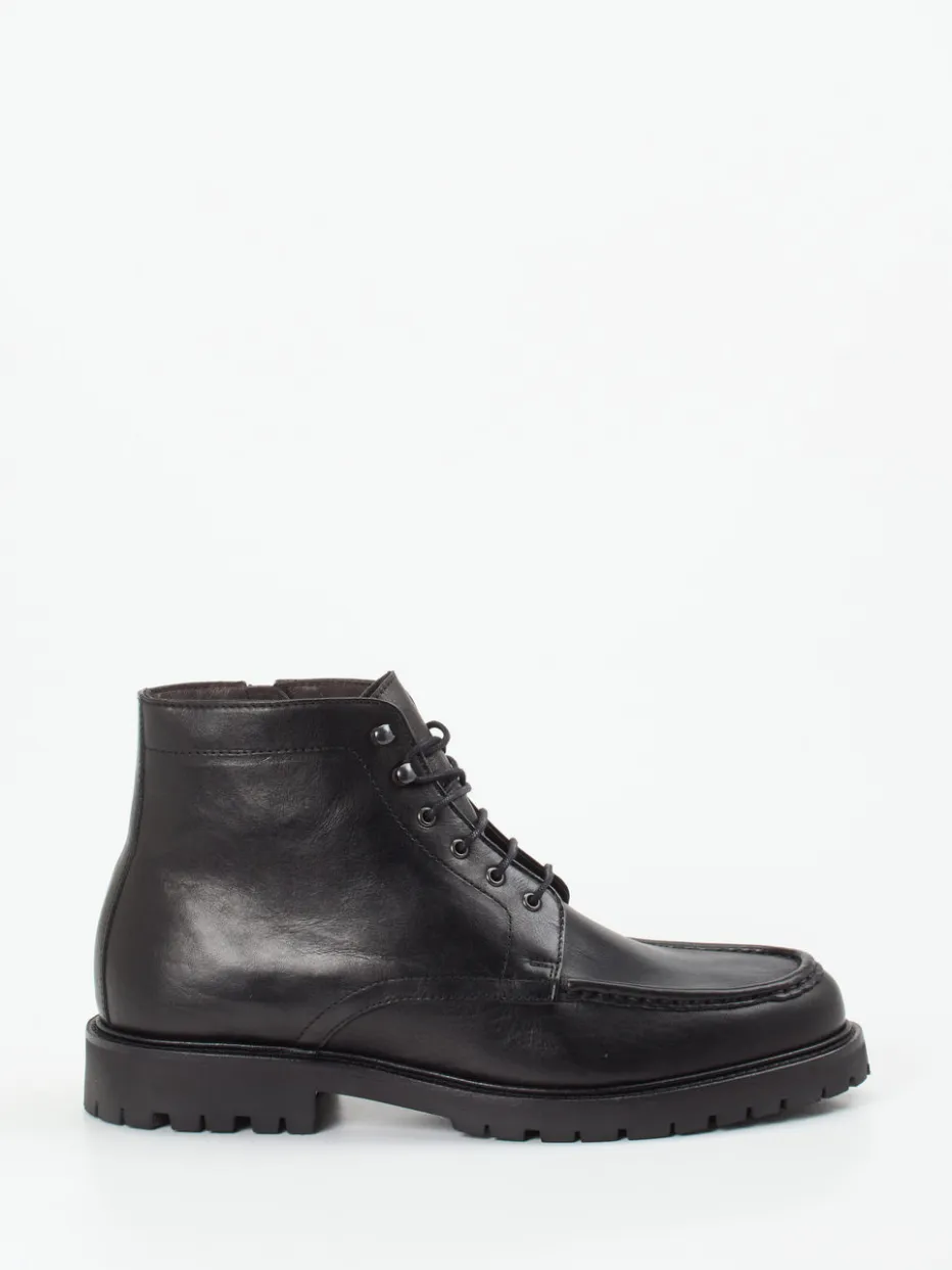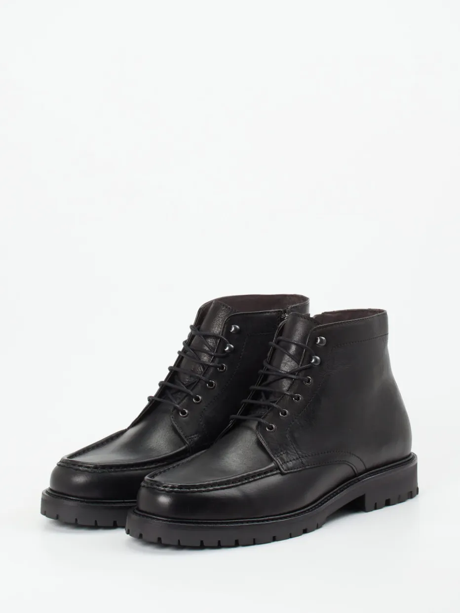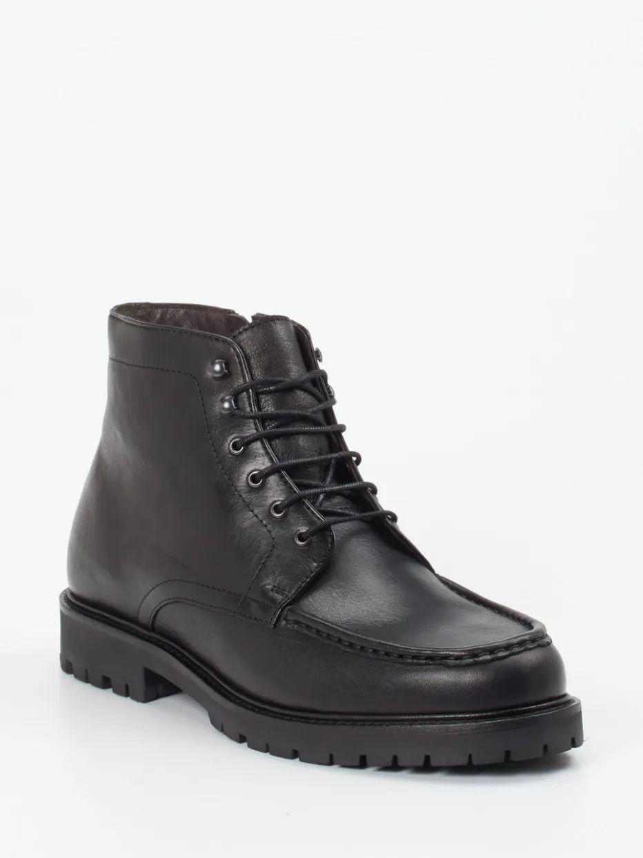 Für Arbeitsweg oder Freizeitweg bestens geeignet: Das schwarze Kalbleder mit matter Oberfläche verleiht den Boots eine dezente Eleganz. Die kompakte Form mit Derbybögen, tonal abgestimmten Nähten und schwarz gehaltenen Metallösen wirkt klar und robust. Eine rutschfeste Gummisohle unterstützt den aktuellen Heavy-Sole-Trend und sorgt für sicheren Tritt. Innen bietet Kalblederfutter mit gepolstertem Fußbett angenehmen Komfort. Die Kombination aus Schnürung und Reißverschluss erleichtert den Einstieg. Stilistisch besonders stark zu dunklen Wollhosen oder Lederaccessoires.