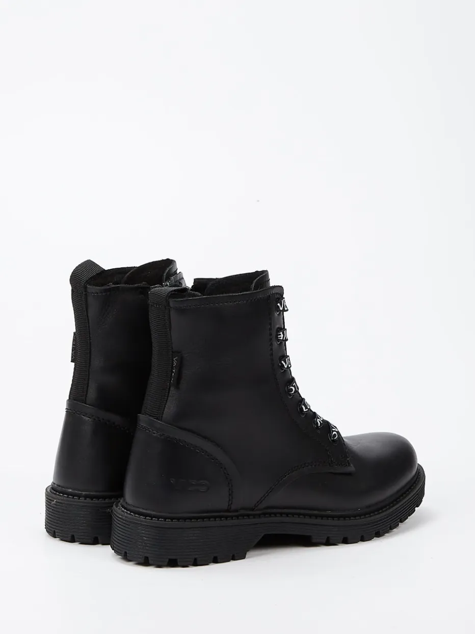 Ein Statement für urbane Kids. Vado präsentiert mit diesen Schnürboots ein markantes Modell aus der Kinderkollektion. Für kühle Tage in Schule und Freizeit bieten die knöchelhohen Boots aus schwarzem Kalbleder zuverlässigen Schutz vor Wind und Nässe. Die matte Oberfläche unterstreicht den funktionalen Charakter, während die schwarz-weiße LOVE-Schnürung klare Akzente setzt. Der seitliche Reißverschluss erleichtert das Anziehen, die tief profilierte Gummisohle sorgt für sicheren Halt. Mit Logomania-Details und chunky Silhouette passt das Modell perfekt in einen modernen Streetwear-Look. Ideal kombinierbar mit wattierten Jacken oder lässigen Jeans. Verbindet expressive Optik mit alltagstauglichem Komfort in Vado-Qualität.