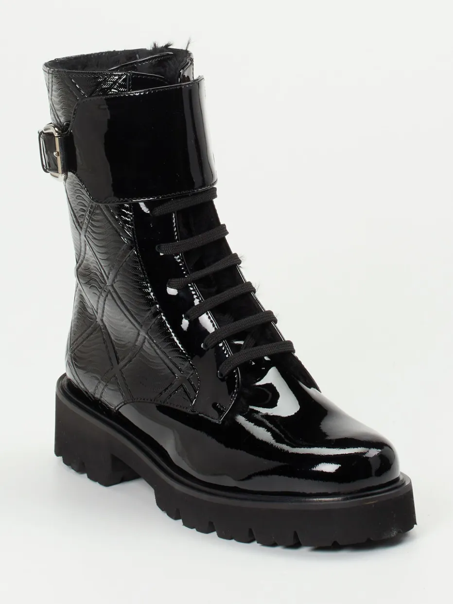Diese damen Schnürstiefelette verbindet glänzendes Lackleder mit Steppstruktur und Lammfellfutter – stilvoll durch die kalte Saison. Funktionale Details treffen auf herbstlichen Trendausdruck.