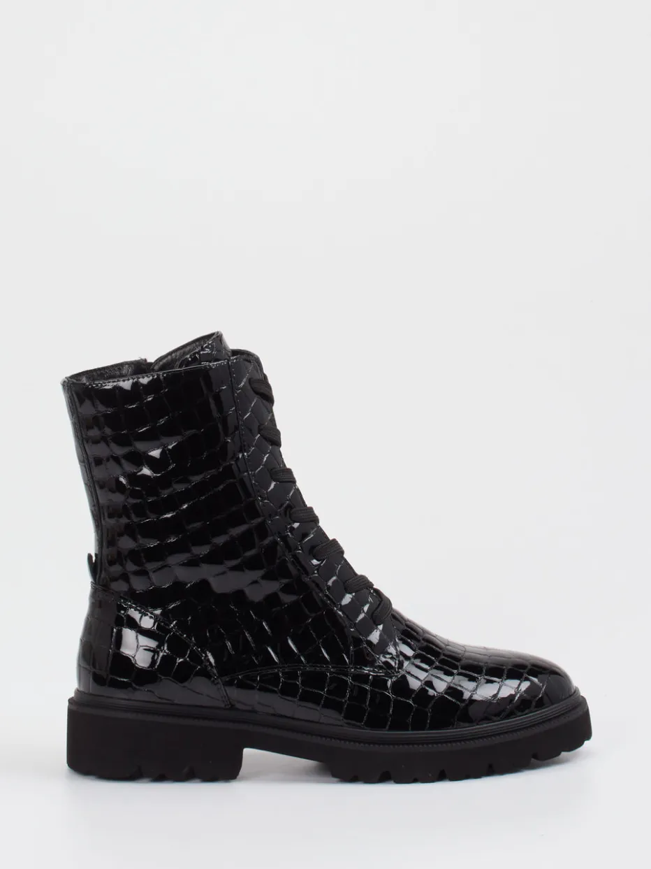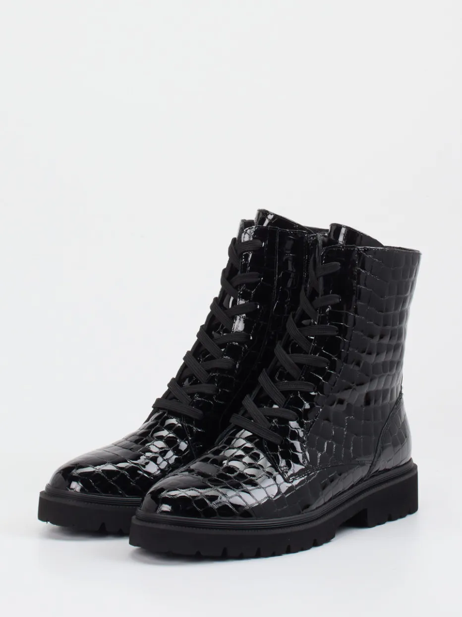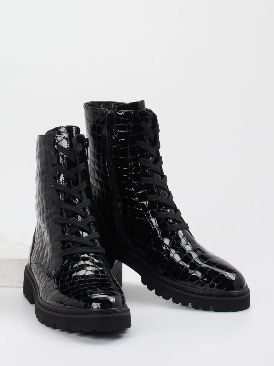 Urbaner Anspruch trifft Designstruktur.Rapid Soul präsentiert diese Damen-Schnürstiefelette mit schwarzer Krokoprägung in glänzender Lackoptik. Für ausdrucksstarke Looks bei Citytrips oder Clubnächten gefertigt, setzt das Modell auf auffällige Textur und robuste Silhouette. Hochglänzendes Lackleder mit gleichmäßiger Krokoprägung trifft auf tonal gearbeitete Schnürung und einen praktischen Innenreißverschluss. Die stark profilierte Gummisohle im Chunky-Design sorgt für sicheren Tritt und modischen Akzent. Typisches Streetwear-Element trifft auf herbstliche Vielseitigkeit – ideal zu Oversized-Coats oder einer Crossbody-Bag in Lederoptik. Ein modisch progressives Modell für stilbewusste Statements mit Profil.