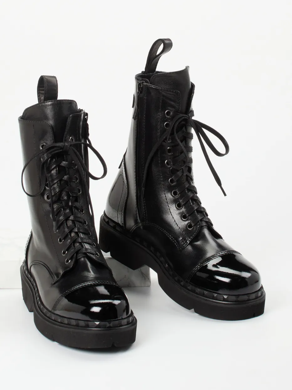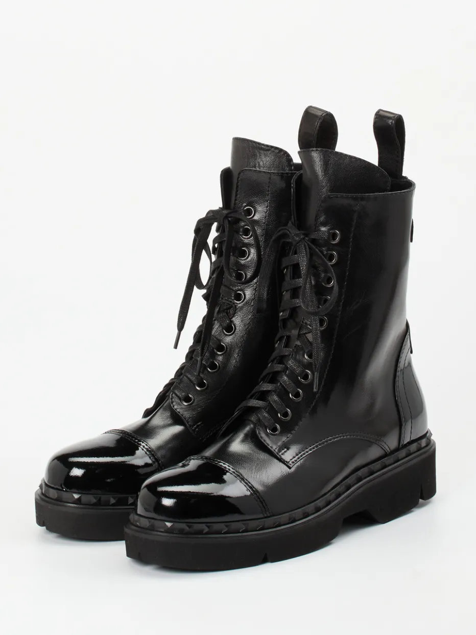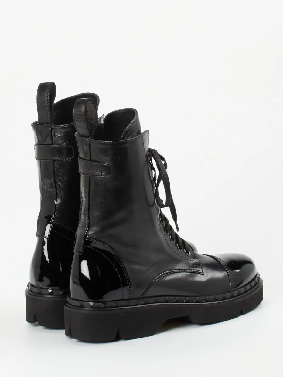 Ideal für urbane Styles mit Selbstbewusstsein: Der hohe Schaft kann sowohl in edgy Freizeit-Looks als auch am Abend überzeugen. Das schwarze Lammleder trifft auf glänzende Partien aus Lackleder an Kappe und Ferse, ergänzt durch markante Ziernieten entlang der profilierten Vibram-Gummisohle. Schnürung und seitlicher Reißverschluss garantieren Komfort, während die Combat-inspirierte Silhouette stilistisch am Puls der Zeit bleibt. Ein cleanes Kombitalent – besonders gut zu Bikerjacke und Lederaccessoires.