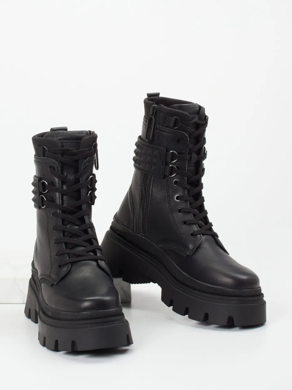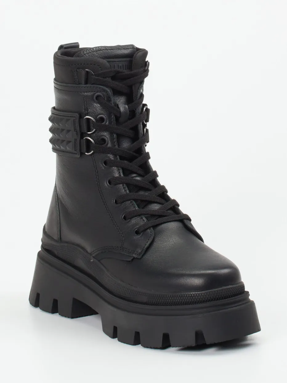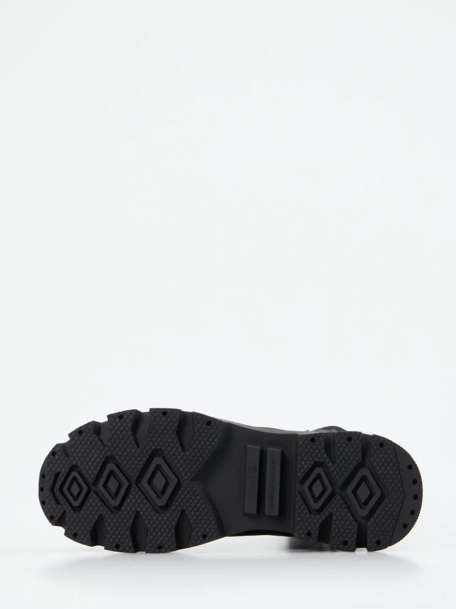 Grunge-Akzente für urbane Styles.Die Marke Palladium präsentiert mit diesen Schnürboots ein ausdrucksstarkes Damenmodell. An kühlen Tagen bietet der hochschaftige Lederstiefel mit seiner angenehmen Textilfütterung zuverlässigen Komfort. Das schwarze, matt wirkende Glattleder wirkt durch die lange Schnürung, den seitlichen Reißverschluss und den nietenverzierten Riemen besonders kernig. Highlight ist die profilierte Chunky-Sohle aus Gummi, die dem Look eine robuste Note verleiht und ihn dem Grunge-Revival der Saison zuordnet. Ideal kombinierbar mit Oversized-Outfits und Hardware-Accessoires. Ein modisch-autonomer Auftritt, der Stilbewusstsein und Funktion vereint.