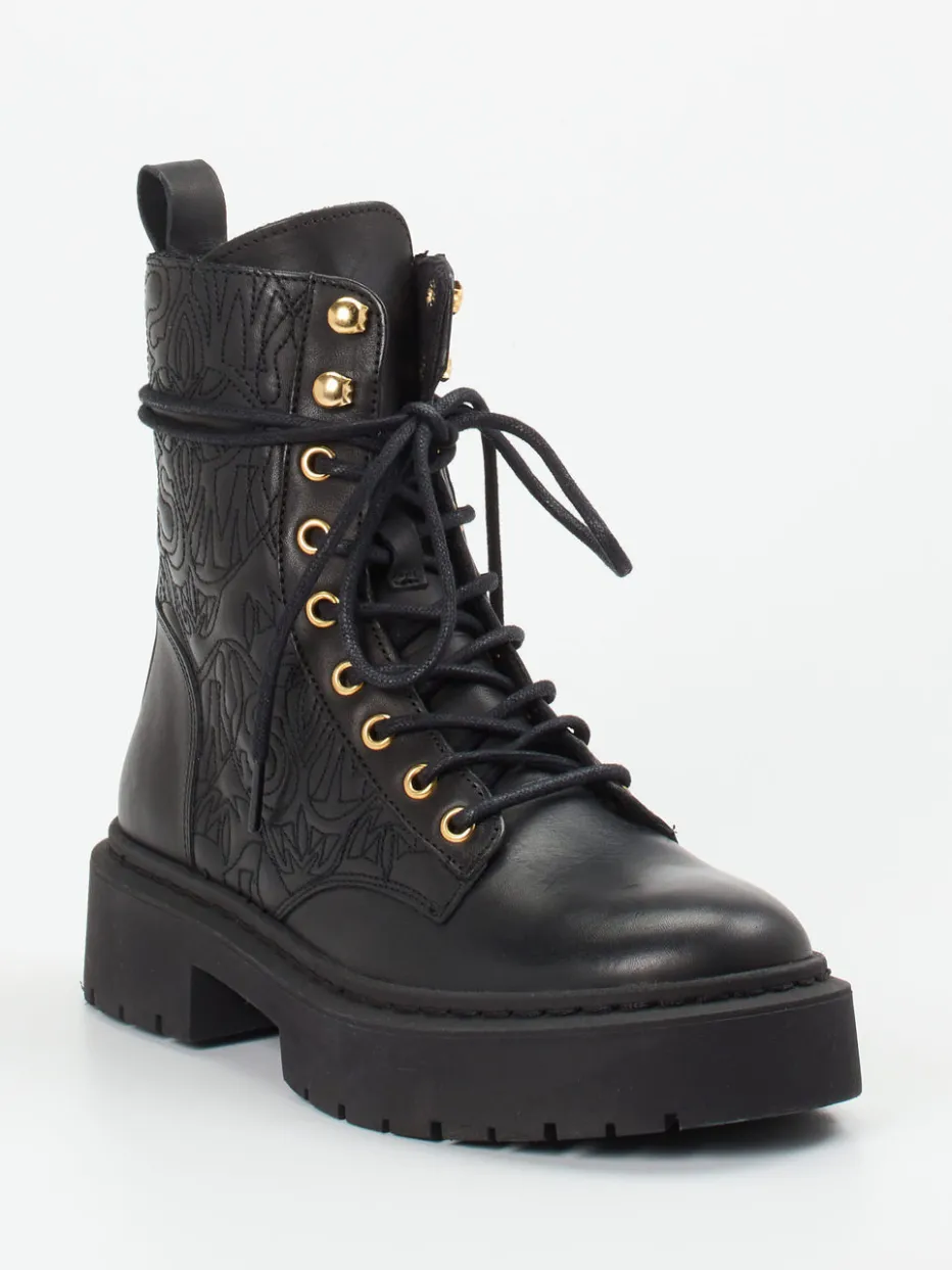 Diese Schnürboots von Steve Madden kombinieren robustes Leder mit goldfarbener Hardware und einem geprägten Monogramm – ein selbstbewusstes Statement im Streetstyle.