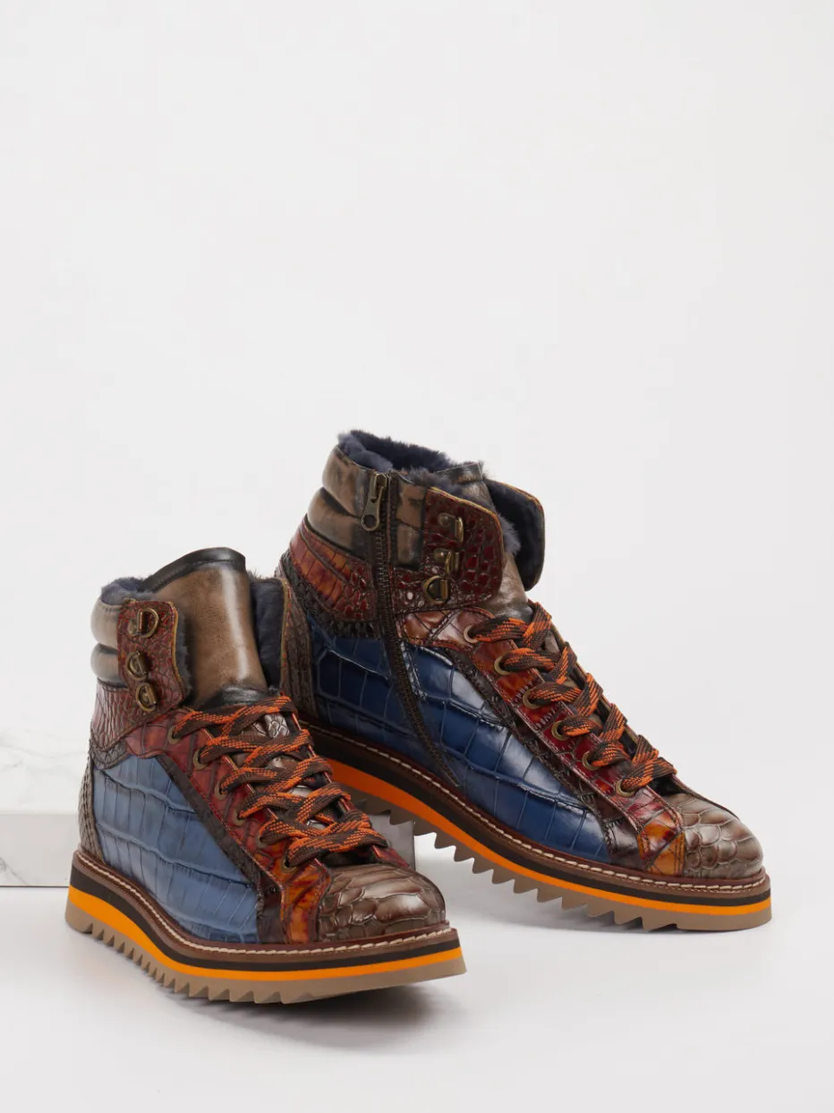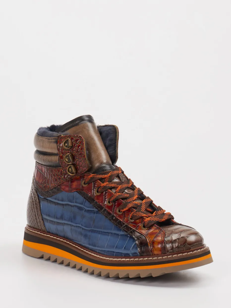 Konstantin Starke präsentiert robuste Schnürboots für Herren. Wenn urbaner Stil auf wetterfesten Komfort treffen soll, sind diese High-Top-Boots die ideale Wahl. Gefertigt aus geprägtem Leder mit glänzender Kroko-Optik verbindet das Modell markante Textur mit einem mehrfarbigen Finish in Dunkelbraun, Dunkelblau und Kupferrot. Die messingfarbenen Metallösen und die robuste Profil-Gummisohle unterstreichen den Streetwear-Charakter. Innen sorgt warmes Lammfellfutter für angenehmen Tragekomfort bei Herbst- und Wintertemperaturen. Kombinierbar zu Outdoorjacke oder gestepptem Weekender, wird dieser Style zum ausdrucksstarken Begleiter. Optik und Funktion in spannendem Materialmix – modisch prägnant von Konstantin Starke.