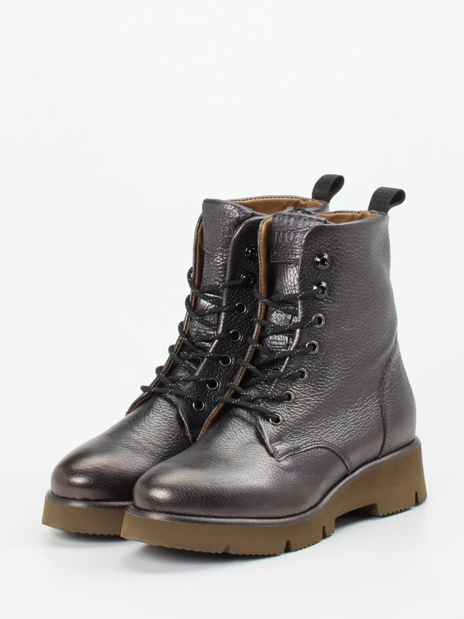 Der robuste Metallicleder-Boot von Piedi Nudi verbindet lässigen Utility-Look mit praktischem Komfort dank Reißverschluss, Wechselfußbett und griffiger Profilsohle.