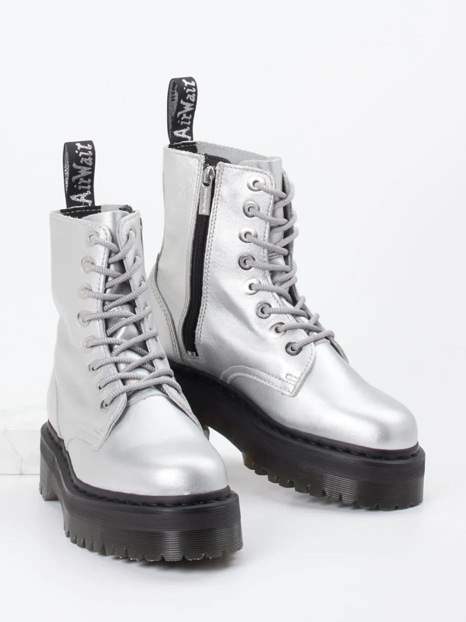 Die glänzenden Metallicleder-Oberflächen in Silber unterstreichen die punkige Silhouette mit breiter Plateausohle – ein Eyecatcher für urbane Looks. Die Kombination aus Schnürung und innenliegendem Reißverschluss erleichtert den Einstieg. Schwarze Zuglaschen mit Markenprint und kontrastierende Sohlennaht setzen zusätzliche Akzente. Inspiriert vom Punk Revival und aktuellen Metallic-Trends der Saison, eignen sich die Boots perfekt für Alltag und Night-Out. Besonders wirkungsvoll zu Oversize-Jacken oder minimalistischen Outfits.