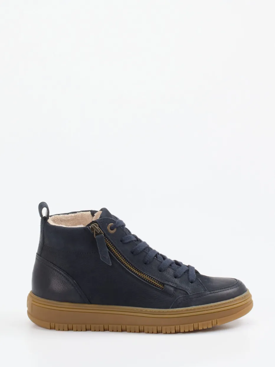 Warmer Komfort für unterwegs.Paul Green präsentiert hier einen Schnürboot für Damen im angesagten High-Top-Design. Ideal für kühle Herbst- und Wintertage bietet dieser knöchelhohe Sneaker aus dunkelblauem Nubukleder mit genarbter Oberfläche wohliges Tragegefühl. Das weiche Frottee-Innenfutter sowie ein gepolstertes Wechselfußbett sorgen für angenehme Wärme und Funktionalität. Ein seitlicher messingfarbener Reißverschluss erleichtert das Anziehen, während die honigfarbene Gummisohle dem minimalistischen Look einen urbanen Akzent verleiht. Die Kombination aus Schnürung und Zuglasche stützt und ergänzt das reduzierte Design. Perfekt zu Jeans oder Thermo-Leggings für entspannte Streetstyles. Langlebige Qualität mit hohem Komfort – typisch Paul Green.