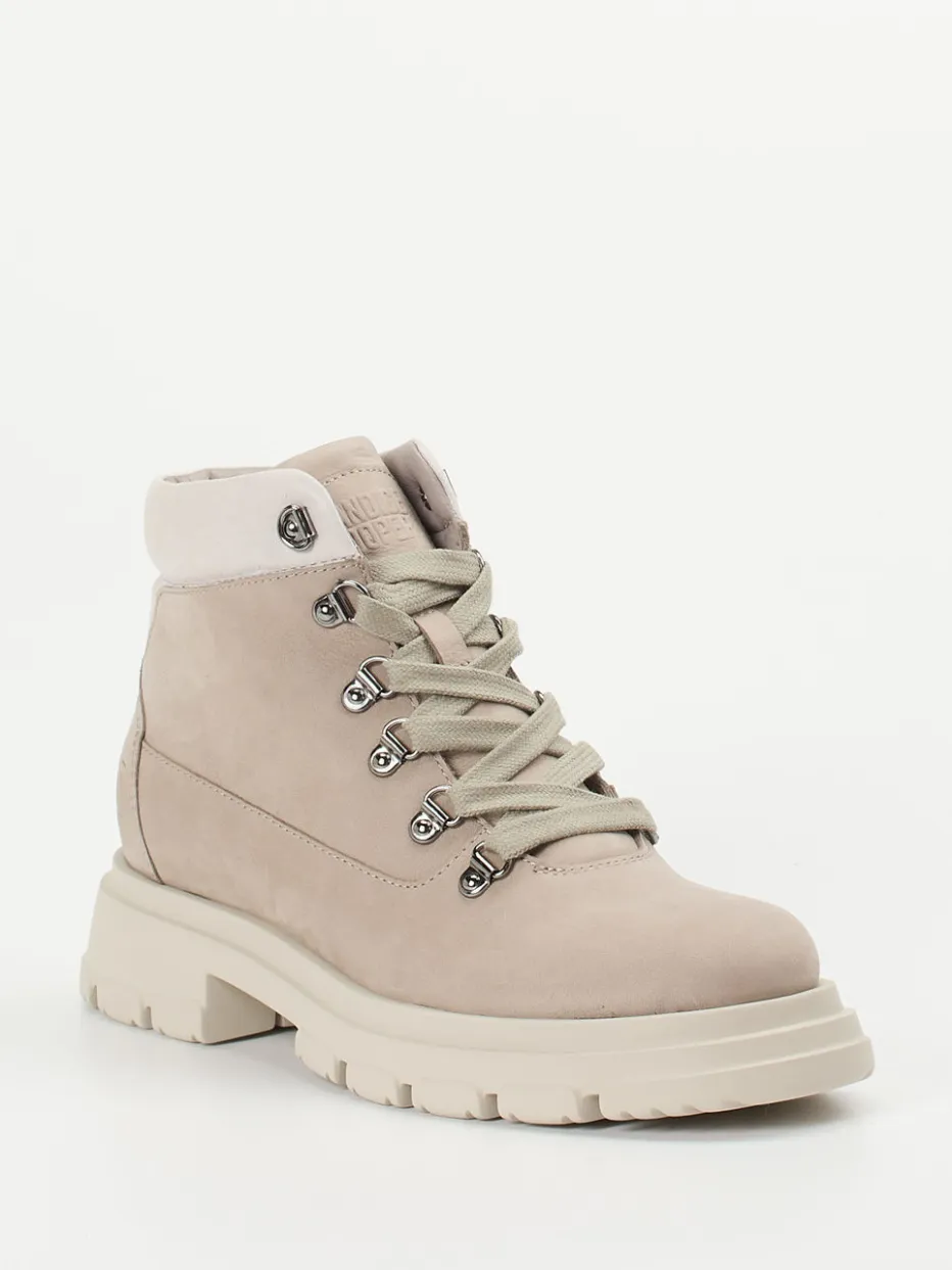 Robustheit im minimalistischen Stil.Candice Cooper präsentiert Schnürboots für Damen mit Outdoor-inspirierter Funktionalität. Ob Spaziergang im Park oder Weg zur Arbeit – diese beigefarbenen Boots aus samtig angeschliffenem Nubukleder überzeugen mit toniger Zickzack-Schnürung, silberfarbenen Metallösen und einer markant profilierten Plateau-Gummisohle. Die matte Oberfläche, abgestimmte Nähte und dezente Markenprägungen prägen den zurückhaltenden Look. Der weich gepolsterte Schaftrand sowie Kalblederfutter erhöhen den Tragekomfort, während das neutrale Farbspektrum ideal zu naturfarbenen Outfits passt. Aktuelle Trendbezüge wie Gorpcore und „Neutral Tones AW24“ treffen auf alltagstaugliches Design. Ein stilsicherer Allrounder mit markentypischem Komfortprofil.
