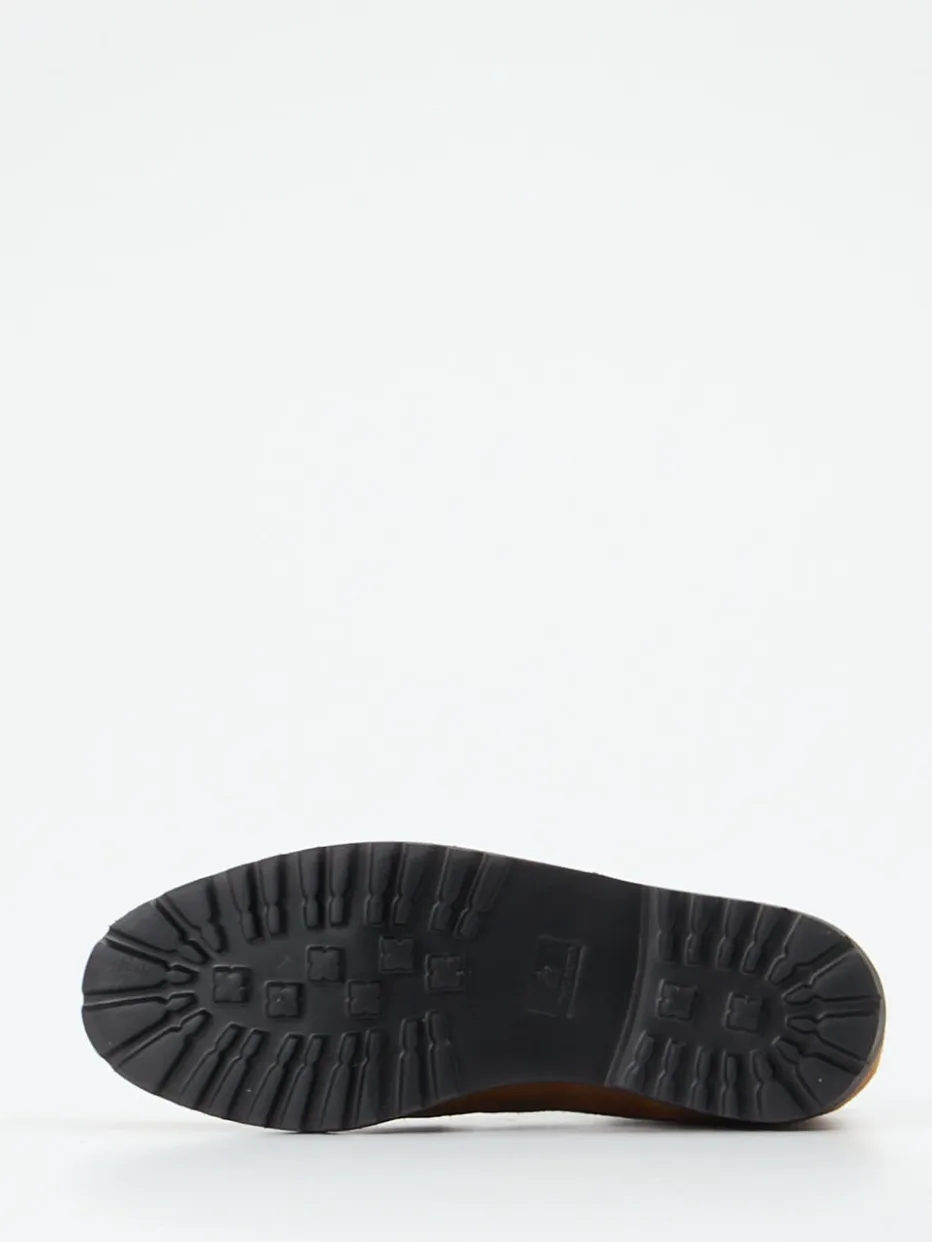 Diese cognacbraunen Schnürboots im Wallabee-Stil verbinden klassisch-maskuline Formgebung mit hochwertigem Veloursleder und funktionaler Gummisohle.
