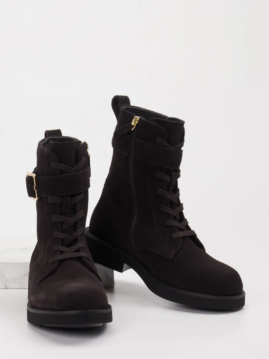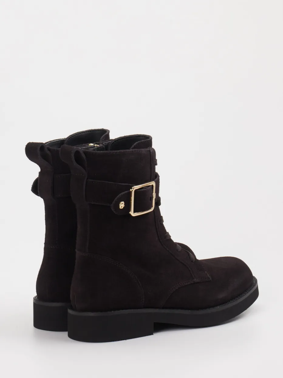 Stilvoll gerüstet für urbane Abenteuer. Die Marke Boss präsentiert robuste Damen-Schnürboots aus Veloursleder – ideal für Herbst und Winter. Das dunkelbraune Obermaterial mit matter Oberfläche und Ton-in-Ton-Nähten sorgt für einen edlen Look, während goldfarbene Hardware und seitlicher Reißverschluss funktionale Akzente setzen. Die klassische Form mit profilierter Gummisohle unterstützt den modischen Military-Einfluss und ergänzt minimalistische Looks mit urbaner Haltung. Besonders geeignet für den Alltag oder abendliche Anlässe mit Stilappeal. Kombiniert mit einer Lederjacke entsteht ein zeitgemäßes Ensemble. Markentypischer Vorteil: dezenter Luxus trifft auf klaren Designanspruch.