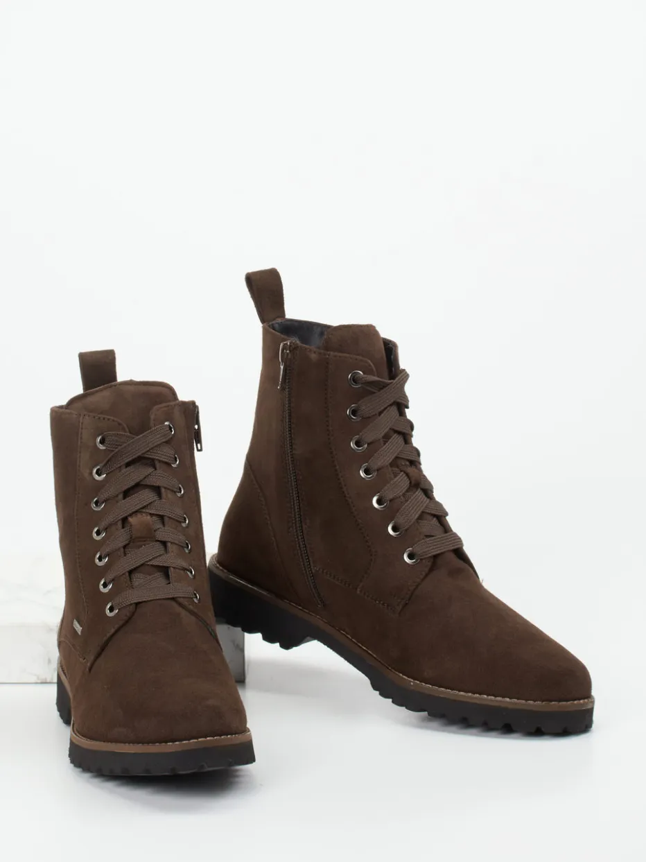 Funktioneller Komfort für Herbsttage.Die Marke Sioux präsentiert diese Damen-Stiefelette in klassischer Schnürbootsform. Für Spaziergänge durch nasskalte Gassen ist dieses Modell wie gemacht: Gefertigt aus samtig angeschliffenem, dunkelbraunem Veloursleder mit wind- und wasserdichter Funktion bietet es zuverlässigen Schutz bei zugleich dezenter Optik. Durch Innenreißverschluss und Zuglasche gestaltet sich der Einstieg besonders komfortabel, während das warme Textilfutter in Felloptik für ein angenehmes Fußklima sorgt. Die griffig profilierte Gummisohle mit farblich abgesetztem Rahmen unterstreicht den funktionalen Outdoor-Anspruch. Dezente Markendetails, Ton-in-Ton Nähte und die klassisch-robuste Silhouette fügen sich stilsicher in entspannte Freizeit-Looks. Ein langlebiger Allrounder mit hochwertigem Tragegefühl – made by Sioux.