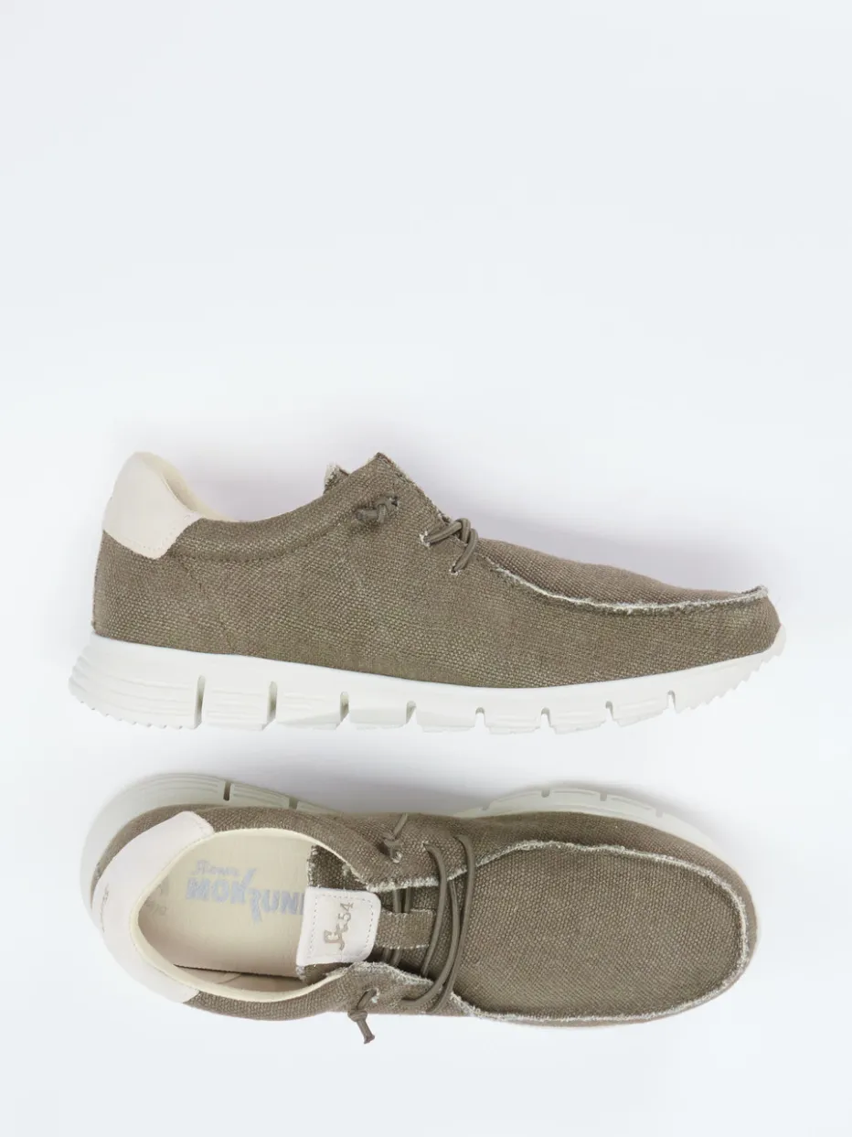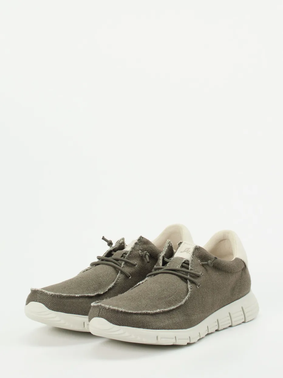 Sommerlich urban inspiriert.Die Marke Sioux interpretiert den klassischen Freizeitschuh sommerlich neu. Für Alltag und entspannte Freizeit vereint dieses Herrenmodell angenehme Leichtigkeit mit modernem Design. Gefertigt aus olivgrauem Canvas mit matter Oberfläche, ergänzt durch fransige Nähte und einen cremefarbenen Fersenbesatz mit Logo, wirkt der Schuh zugleich lässig und stilvoll. Die flache, rund zulaufende Silhouette mit elastischer Schnürung betont den Street-Style-Charakter – unterstützt von einer flexiblen, rutschhemmenden Gummisohle mit tiefen Flexkerben. Das softe, gepolsterte Wechselfußbett sorgt für langanhaltenden Tragekomfort. Sioux kombiniert Komfort und Canvas-Trendkompetenz in einem durchdachten Alltagsmodell.