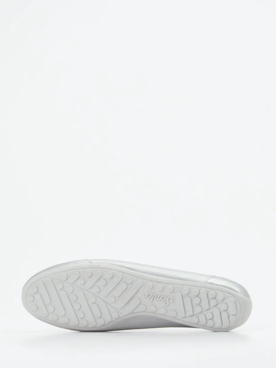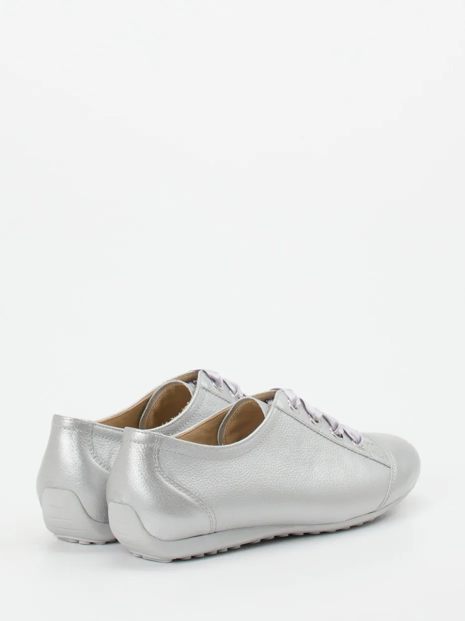 Für entspannte Alltagseinsätze bietet das Modell ein bequemes Tragegefühl und dezente Raffinesse. Das verwendete Metallicleder zeigt eine edel genarbte Oberfläche, während die Schnürung mit Satinband eine feminine Note einbringt. Die flache Silhouette in Silber und die gepolsterte Ferse unterstreichen den sportiv-lässigen Charakter. Die profilierte Gummisohle verleiht Trittsicherheit, auch bei entspannter Homewear. Der Look liegt ganz im Metallic-Akzent-Trend der Saison.