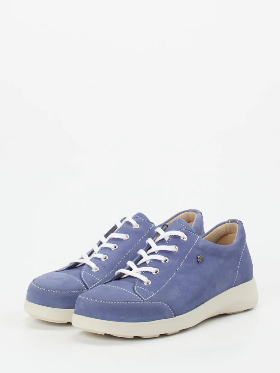 Gefertigt aus samtig angeschliffenem Nubukleder in Lavendelblau, bietet das Modell durch die weiß profilierte PU-Sohle eine angenehme Dämpfung und Ergonomie. Mit rundem, fußfreundlichem Leisten, gepolstertem Schaftrand sowie herausnehmbarem, lederbezogenem Fußbett wird gehobener Komfort spürbar. Silberfarbene Ösen, weiße Schnürsenkel und Kontrastnähte betonen den sportlich-minimalistischen Charakter. Ein idealer Partner zu Stretch-Jeans oder kühlen Naturtönen.