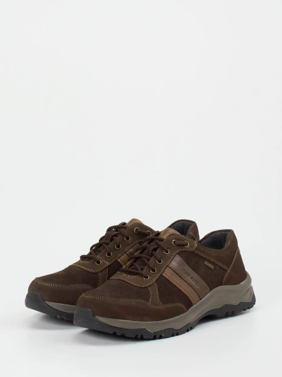Für Aktivitäten in Stadt oder Natur bietet das samtig angeschliffene Nubukleder mit mattem Finish in Dunkelbraun eine strapazierfähige und zugleich stilvolle Basis. Kontrastnähte, verstärkte Fersenpartien sowie ein seitliches Logotag unterstreichen das funktionale Design. Das atmungsaktive Innenfutter aus Mesh und die gepolsterte Schaftpartie erhöhen den Tragekomfort. Dank robuster Gummisohle mit starkem Profil ist Trittsicherheit auch in unwegsamem Gelände gewährleistet – ideal für comfortorientierte Outdoor-Looks. Kombiniert mit Funktionshose und Jacke entsteht ein harmonisches Freizeit-Ensemble.