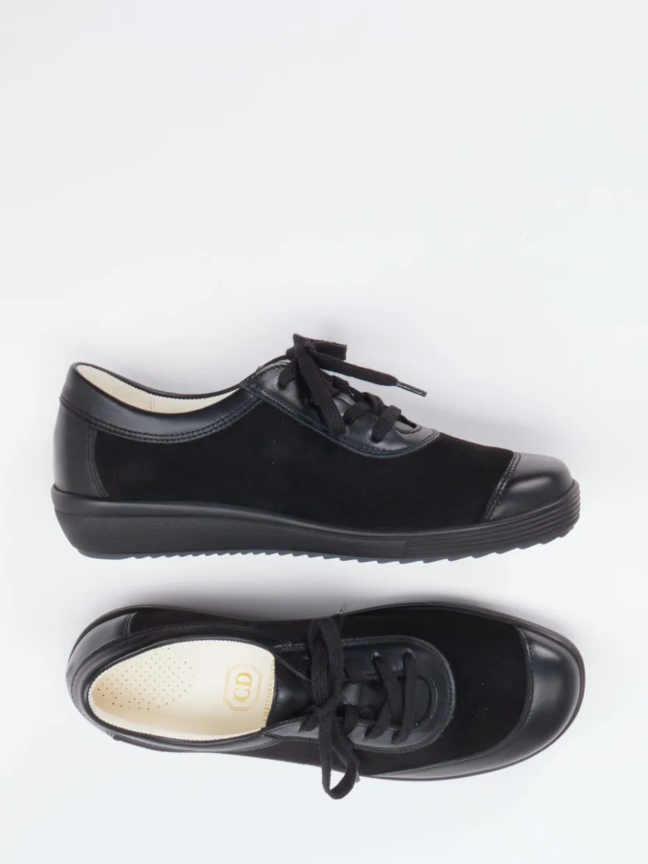 Schwarz trifft Komfort.Christian Dietz präsentiert hier einen bequemen Schnürschuh für Damen. Ideal für lange Tage auf den Beinen bietet dieses Modell durch die Weite H und die gepolsterte Gummisohle ein Plus an Tragekomfort. Die Kombination aus Stretchmaterial, Glattleder und samtigem Veloursleder sorgt für Flexibilität und ein angenehmes Tragegefühl. Die tonale Farbgebung in Schwarz, das dezente Oberflächenspiel sowie die abgerundete Form wirken modern und zurückhaltend. Die herausnehmbare Innensohle unterstreicht den funktionalen Designanspruch. Dank minimalistischer Linienführung ergänzt der Schuh vielseitige Alltags- und Freizeitoutfits. Ein besonders tragbarer Komfortfavorit für anspruchsvolle Füße.