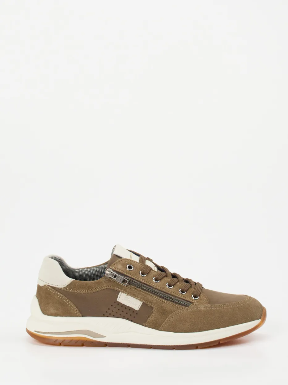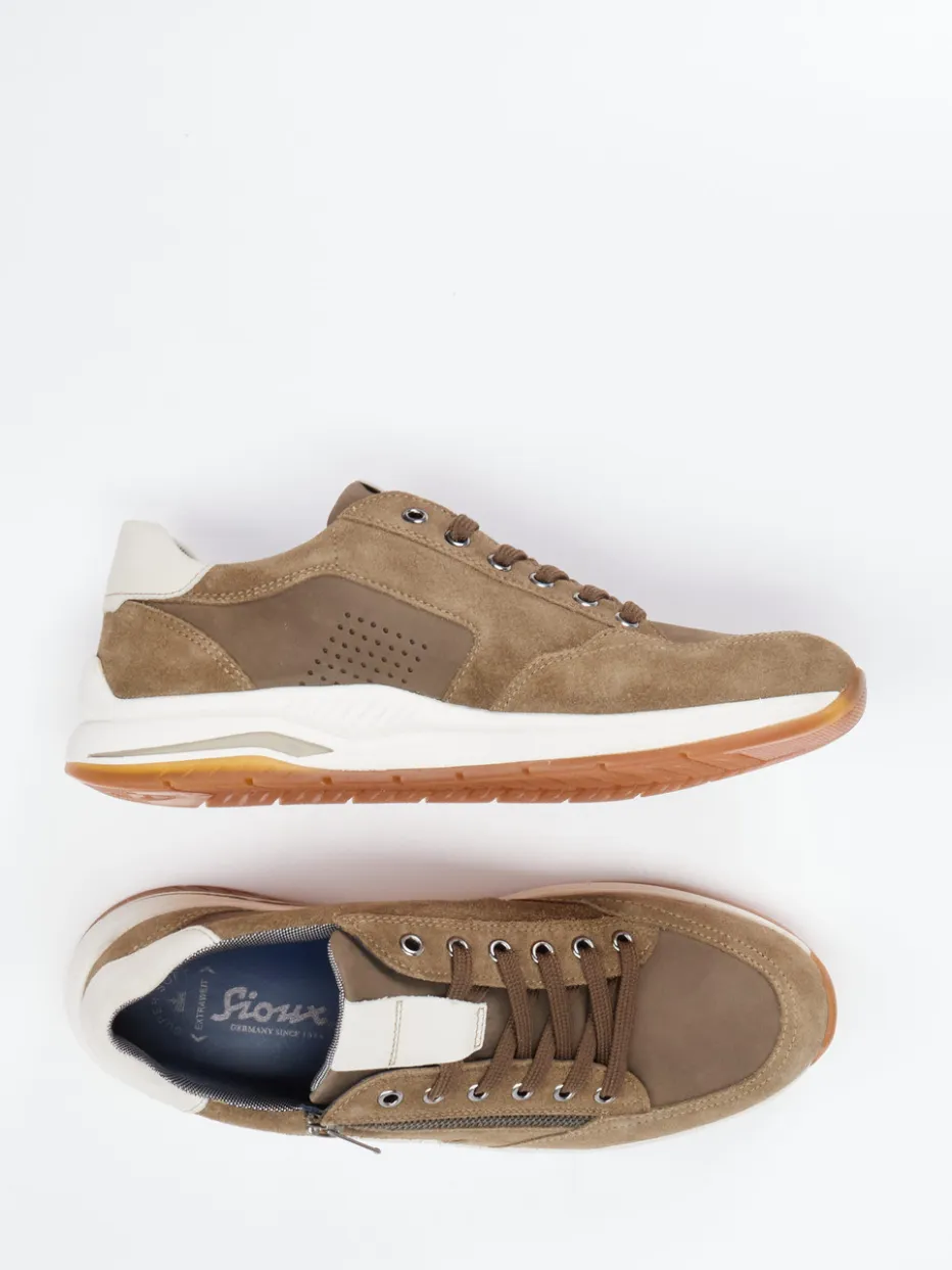 Vielseitiger Begleiter mit lässigem Appeal.Sioux präsentiert mit diesem bequemen Schnürschuh ein modisches Herrenmodell für Alltag und Freizeit. Die Kombination aus olivgrünem Veloursleder, mattierter Oberfläche und cremefarbenen Akzenten verleiht dem Schuh einen markanten, aber unaufdringlichen Look. Ein seitlicher Reißverschluss ergänzt die klassische Schnürung und sorgt für leichten Einstieg. Die perforierte Seitenpartie, die weich gepolsterte Innensohle und die profilstarke Gummisohle versprechen angenehmen Tragekomfort. Inspiriert von Streetwear und Retro-Running, passt der sportlich-urbane Sneaker ideal zu Casual-Outfits mit Naturtönen oder leichten Outdoorjacken. Stilvoller Komfort mit hochwertiger Sioux-Verarbeitung.