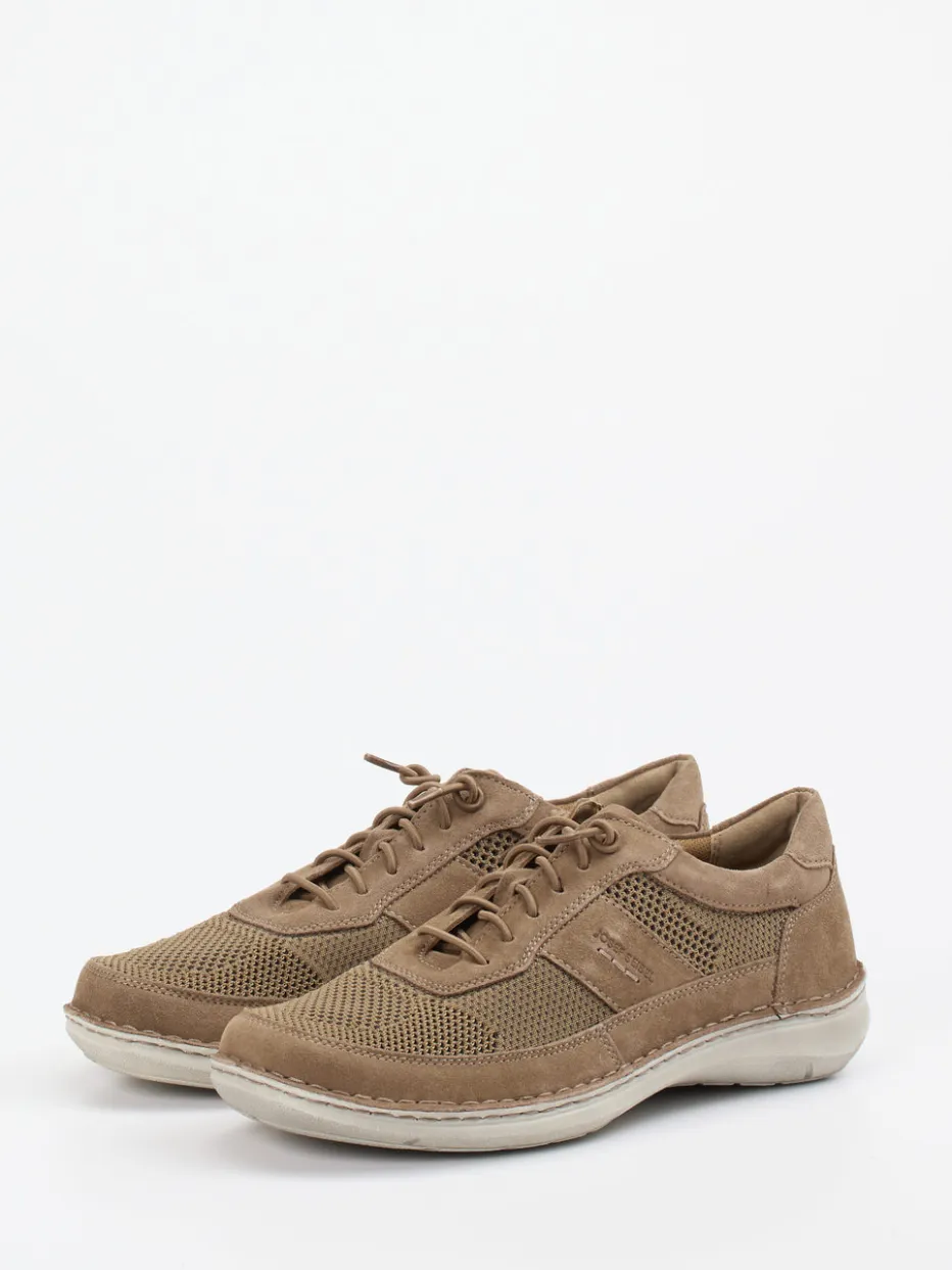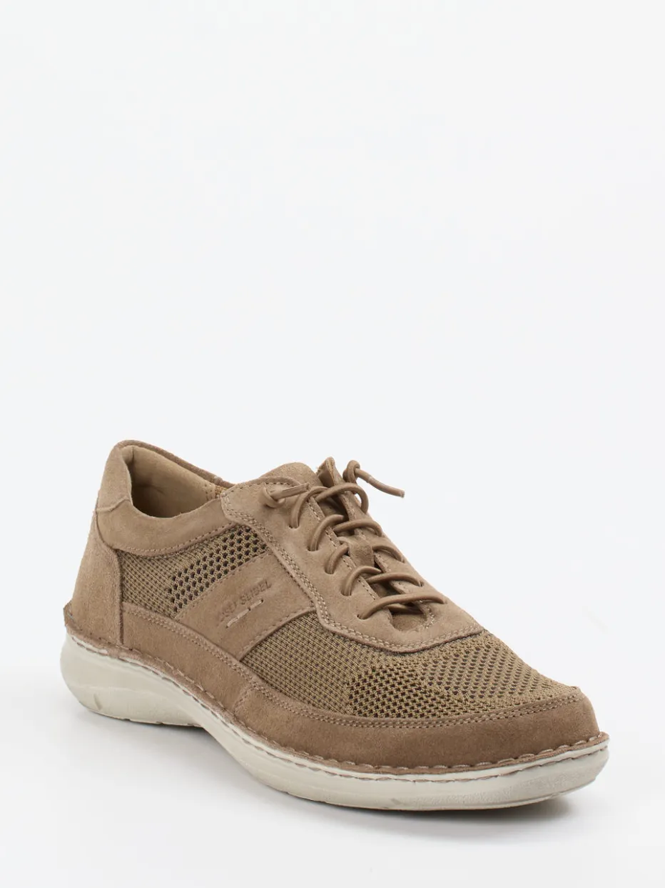 Leichtfüßig durch warme Tage.Josef Seibel präsentiert einen bequemen Schnürschuh für Herren. Ob beim Stadtbummel oder im Garten: Das atmungsaktive Veloursleder, ergänzt durch luftig strukturiertes Mesh, sorgt für ein ausgeglichenes Fußklima. Der Schuh zeigt sich in sandbeiger Tonalität mit klassisch abgerundeter Silhouette, tonigen Nähten und einem dezenten seitlichen Logodetail. Die weiche Polsterung rund um den Einstieg sowie eine griffige Gummisohle unterstreichen den gehobenen Tragekomfort. Dank herausnehmbarem Fußbett ist das Modell auch für Einlagen geeignet und folgt aktuellen Natural-Tones-Trends. Markentypische Verarbeitung mit Fokus auf Komfort und Alltagstauglichkeit.