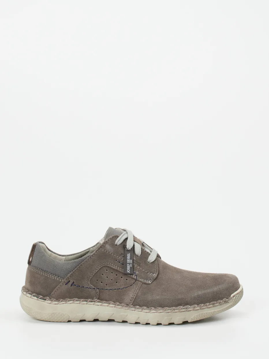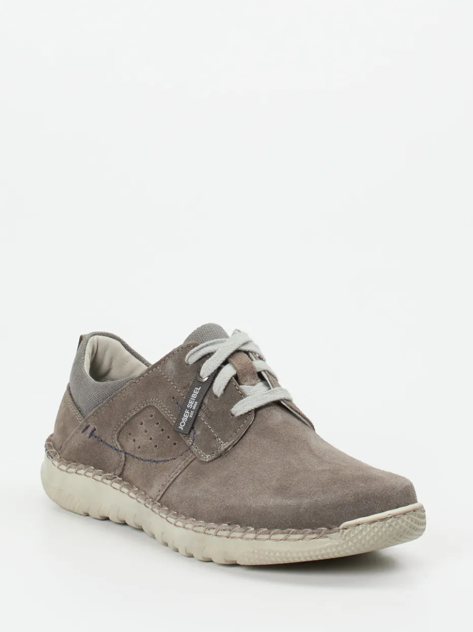 Casual-Komfort in harmonischen Grautönen.Josef Seibel präsentiert mit diesem Schnürschuh ein Modell für Herren, das Komfort und dezentes Design verbindet. Für entspannte Tage im Alltag oder unterwegs überzeugt das Modell durch taupefarbenes Veloursleder mit samtiger, matter Oberfläche und dezente Mesh-Textilakzente. Die abgerundete Silhouette, kontrastierende Nähte und ein geprägtes Markenlabel unterstreichen den reduzierten Look. Die gepolsterte Innenausstattung, ein herausnehmbares Fußbett und die griffige Gummisohle sorgen für angenehmes Tragegefühl. Passend zum „Slow Living“-Trend entfaltet sich hier subtiler Stil mit Funktion. Ideal kombinierbar mit Chinohosen und leichten Freizeitjacken. Ein Vielseitigkeitsschuh mit markentypisch bequemem Auftritt.