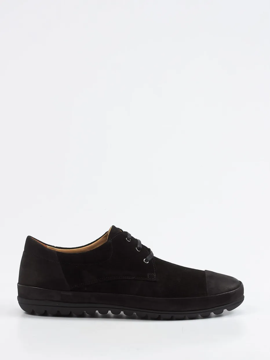 Zeitgemäßer Minimalismus trifft auf funktionale Details: Der schwarzmatte Derby von Franz Gustav überzeugt durch komfortable Profilsohle und strukturierte Ledertextur.