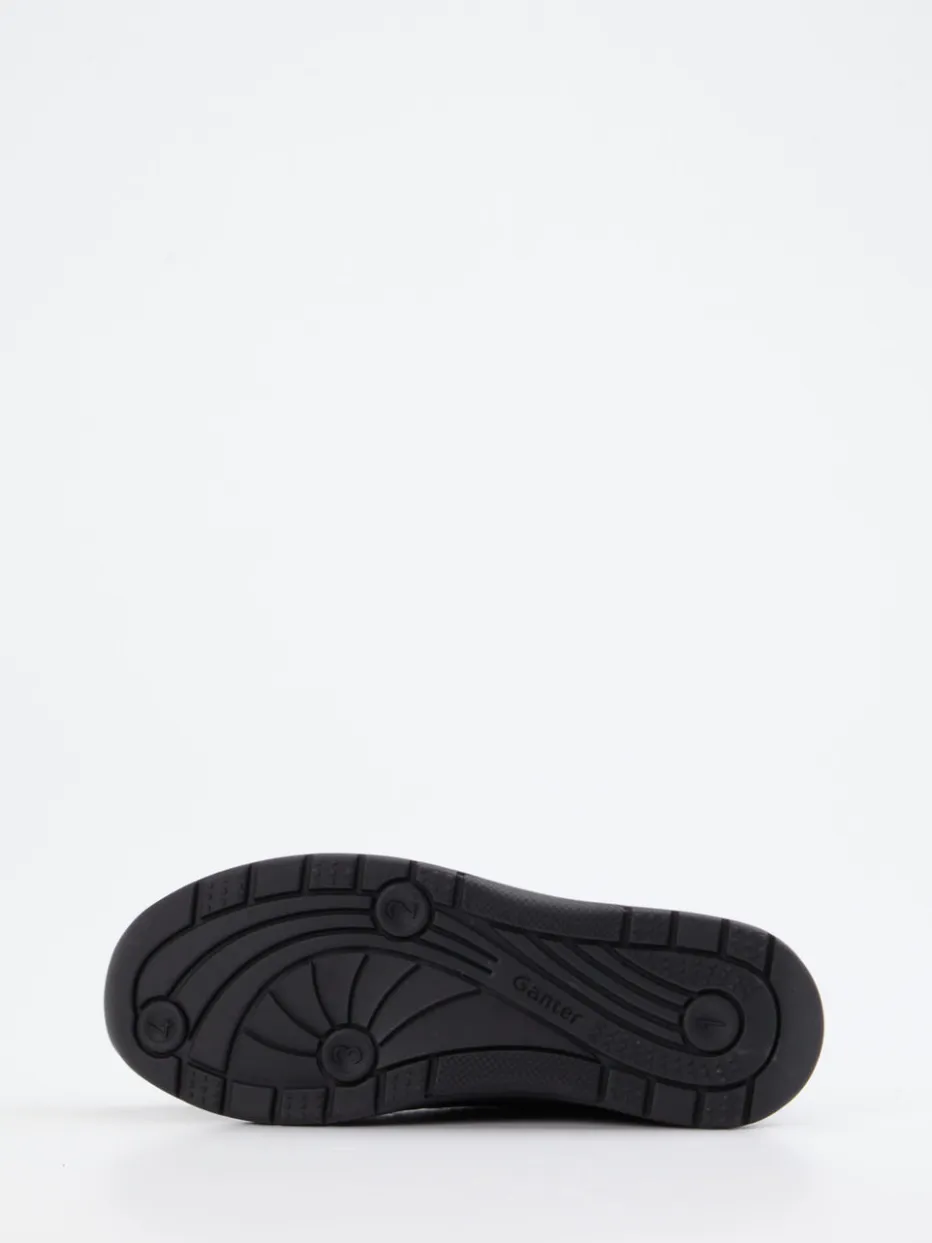 Schwarz mit Substanz.Ganter bringt mit diesem Komfort-Sneaker für Damen einen urbanen Klassiker in die Herbst/Winter-Garderobe. Ob beim Stadtspaziergang oder im Alltag – der rund und voluminös geschnittene Schnürschuh aus samtig angeschliffenem Veloursleder überzeugt durch glänzende Lackleder-Overlays und eine ergonomische Gummisohle. Die Ton-in-Ton-Schnürung, der gepolsterte Schaftrand und das Lederfutter unterstreichen die hochwertige Verarbeitung. Das Design bewegt sich zwischen Streetstyle und elegantem „Quiet Luxury“-Look – ausgeführt in klassischem Schwarz. Besonders ideal zu monochromen Outfits oder minimalistischen Layering-Styles. Ein bequemer City-Sneaker mit zeitgemäßem Profil und feinem Materialspiel.