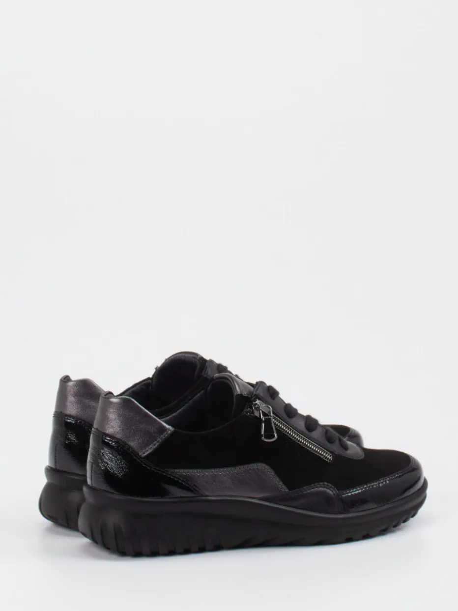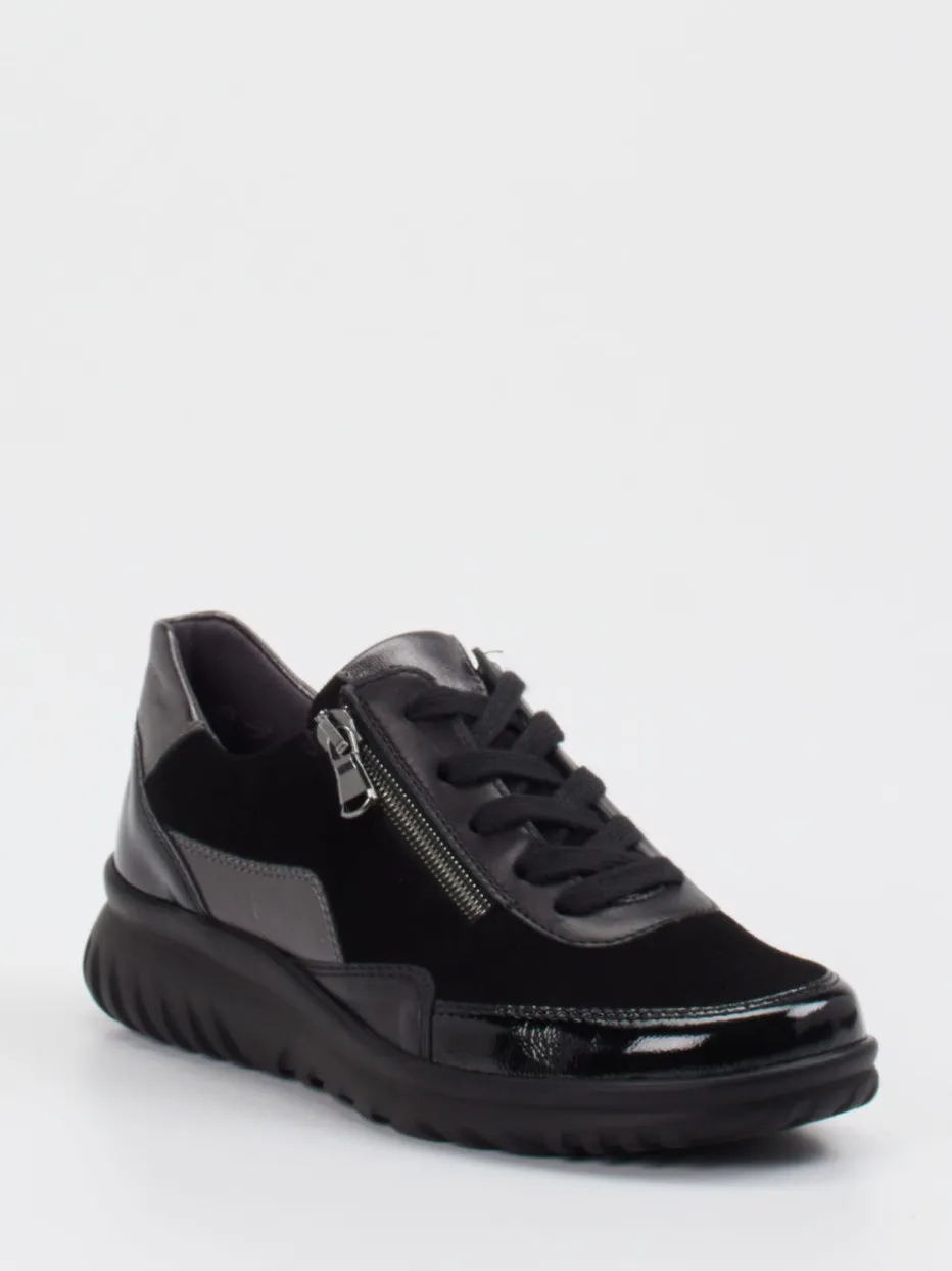 Schwarzer Komfort mit moderner Funktionalität.Semler interpretiert den Komfortsneaker mit einem vielseitigen Schnürschuh in edlem Schwarz. Ideal für Tage mit viel Bewegung sorgt die ergonomisch geformte PU-Sohle für ein angenehm gedämpftes Laufgefühl. Der strukturierte Materialmix aus samtig angeschliffenem Veloursleder und glänzenden Partien in Lackleder-Optik verleiht dem Modell seinen schlichten, modernen Charakter. Die Kombination aus Schnürung und seitlichem Reißverschluss erleichtert das An- und Ausziehen. Die gepolsterte Fersenkappe und das atmungsaktive Leder-/Textilfutter unterstreichen den funktionalen Anspruch. Dezent sportlich und citytauglich – ein verlässlicher Begleiter mit Semler-Komfortanspruch.