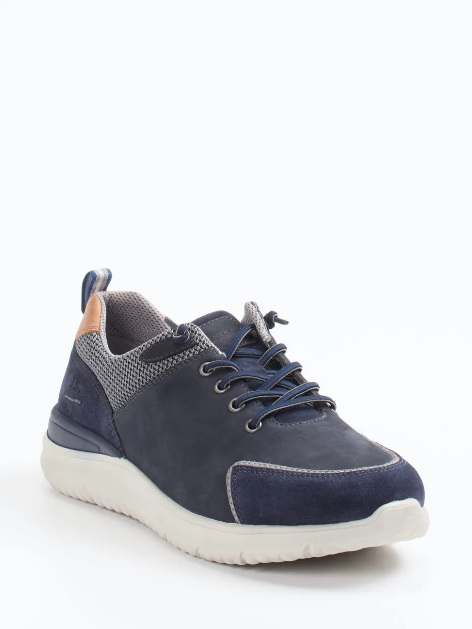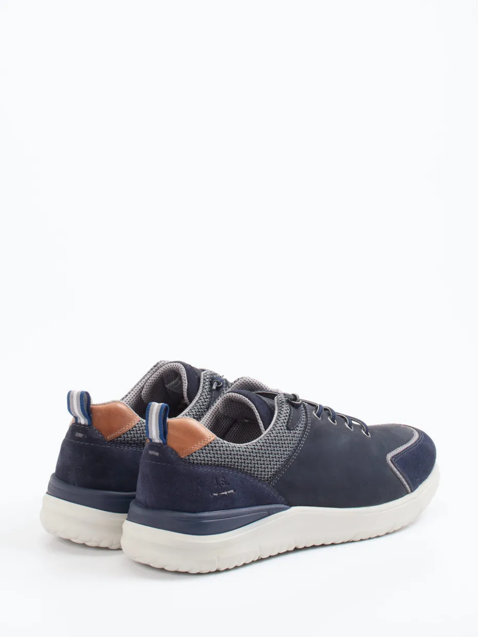 Sportlicher Komfort für den Alltag.Josef Seibel präsentiert einen stilvollen Herren-Sneaker in der Kategorie Schnürschuhe. Ideal für entspannte Tage in der Stadt oder unterwegs im Alltag: Das Modell vereint robustes Nubukleder mit samtig angeschliffener Oberfläche und atmungsaktive Mesh-Einsätze. Optisch setzen sich das dunkle Blau, hellgraue Kontraste und cognacfarbene Akzente stilvoll ab. Das sportlich-runde Design mit Zuglasche und weich gepolstertem Einstieg sorgt für angenehmen Halt und ein leichtes Tragegefühl – ideal im Kontext des aktuellen Quiet-Comfort-Trends. Die rutschfeste Gummisohle bietet sicheren Grip auf verschiedenen Untergründen. Verlässlicher Allrounder mit markentypischem Komfortfokus.