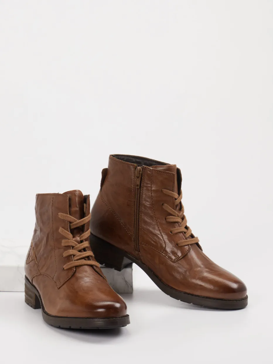 Für herbstliche Spaziergänge oder tägliche Erledigungen bietet dieses Modell aus mittelbraunem Kalbleder mit glatter, leicht glänzender Oberfläche eine gelungene Kombination aus Stil und Funktion. Die klassische, knöchelhohe Form wird durch eine strukturierte Gummisohle ergänzt, die rutschfesten Halt sichert. Zusätzlich vereint die Schnürung mit dem seitlichen Reißverschluss leichte Handhabung mit individuellem Sitz. Dezente Ton-in-Ton-Nähte unterstreichen den unaufgeregten Look dieser Casual-orientierten Silhouette. Optimal kombinierbar mit Jeans und Strick für entspannte Alltagslooks.