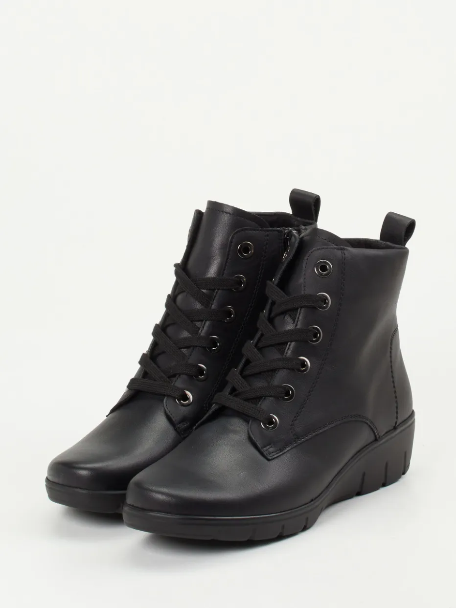 Stilvoll durch jeden Herbsttag.Die Marke Semler präsentiert mit dieser Schnürstiefelette ein Modell, das Komfort und schlichte Eleganz vereint. Ideal für den Alltag im Büro wie in der Freizeit: Das weiche, schwarze Kalbleder unterstreicht den minimalistischen Look, während die matte Oberfläche und tonige Nähte zurückhaltende Raffinesse bieten. Metallösen in Silberoptik setzen dezente Akzente. Die Kombination aus Schnürung und Reißverschluss sorgt für optimalen Sitz und einfaches Handling. Der knöchelhohe Schnitt mit Keilsohle bietet Stabilität und unterstützt durch das herausnehmbare Fußbett den Einsatz individueller Einlagen. Die griffige PU-Sohle ist rutschhemmend und federnd zugleich. Ein Alltagsbegleiter mit Komfortfaktor – made by Semler.