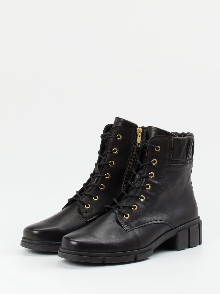 Komfort trifft auf markante Akzente.Solidus präsentiert eine stilvolle Schnürstiefelette für Damen, gefertigt aus weichem schwarzem Kalbleder. Ideal für kühle Tage, bietet sie dank der komfortablen Polsterung am Schaftrand und der markant profilierten Gummisohle angenehmen Halt. Goldfarbene Metallösen und ein seitlicher Reißverschluss setzen dezente Akzente im monochromen Design. Die klassische, knöchelhohe Form und die klare Silhouette orientieren sich an minimalistischer Utility-Ästhetik. Das herausnehmbare Fußbett ermöglicht den Einsatz eigener Einlagen. Perfekt kombinierbar mit schmalen Hosen und Steppjacken für urbane Herbst-Looks. Ein durchdachtes Komfort-Design mit modernem Outdoor-Flair – typisch Solidus.
