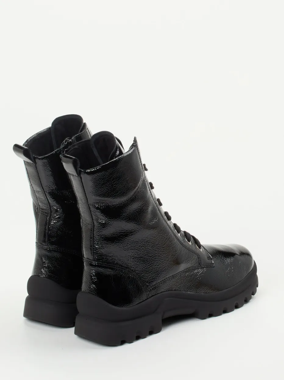 Diese Semler-Stiefelette verbindet glänzendes Lackleder mit funktionalem Design und hohem Tragekomfort – ideal für urbane Stilbrüche mit Anspruch.