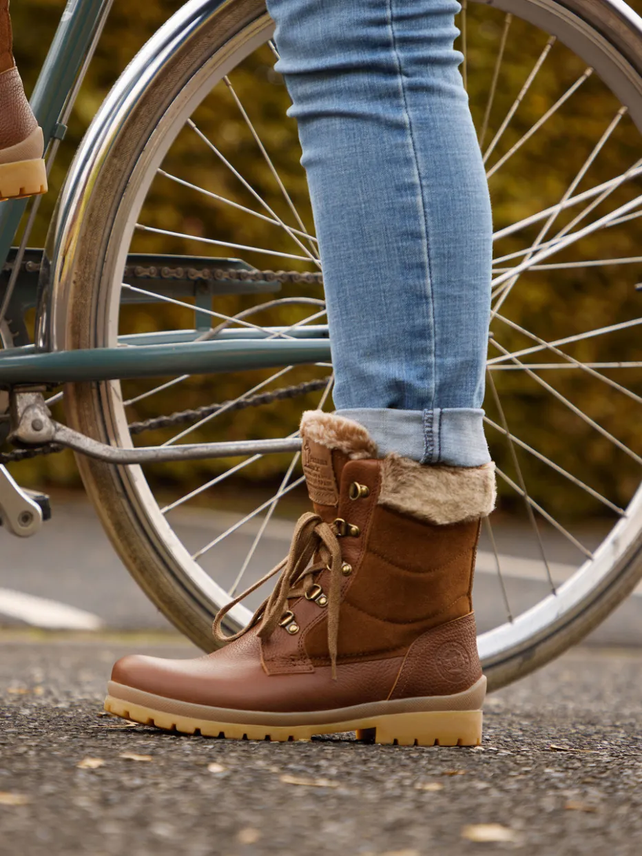 Rustikales Design trifft funktionale Wärme.Die Damen-Stiefelette von Panama Jack überzeugt durch warme Ausstrahlung und langlebige Materialien. Für Spaziergänge in frostiger Herbstluft oder entspannte Alltagsmomente entwickelt, kombiniert das Modell fein genarbtes Lammnappa mit weich angerautem Veloursleder in Cognac- und Beigetönen. Die messingfarbenen Metallösen geben der robusten Schnürung authentischen Heritage-Charme, während das braune Kunstfellfutter innen und am Einstieg für wohlige Wärme sorgt. Die flache Gummisohle mit kräftigem Profil unterstützt auf rutschigem Untergrund. Lässig zur Thermoleggings und Parka kombinierbar. Zuverlässige Qualität mit komfortabler Ausstattung im charakteristischen Panama Jack Look.