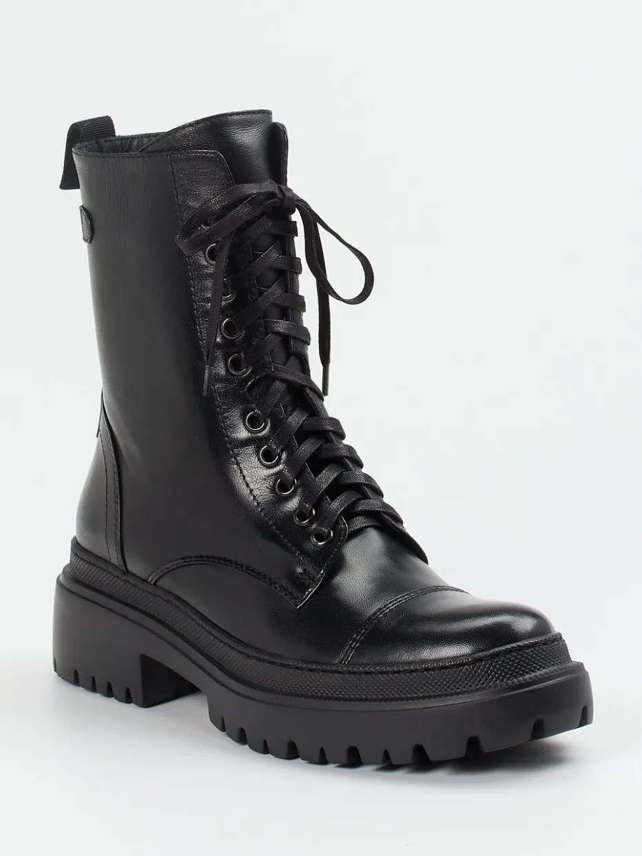 Diese Schnürstiefelette vereint glänzendes Lammleder mit robuster Profilsohle und punktet durch Komfort und urbane Stilsicherheit.