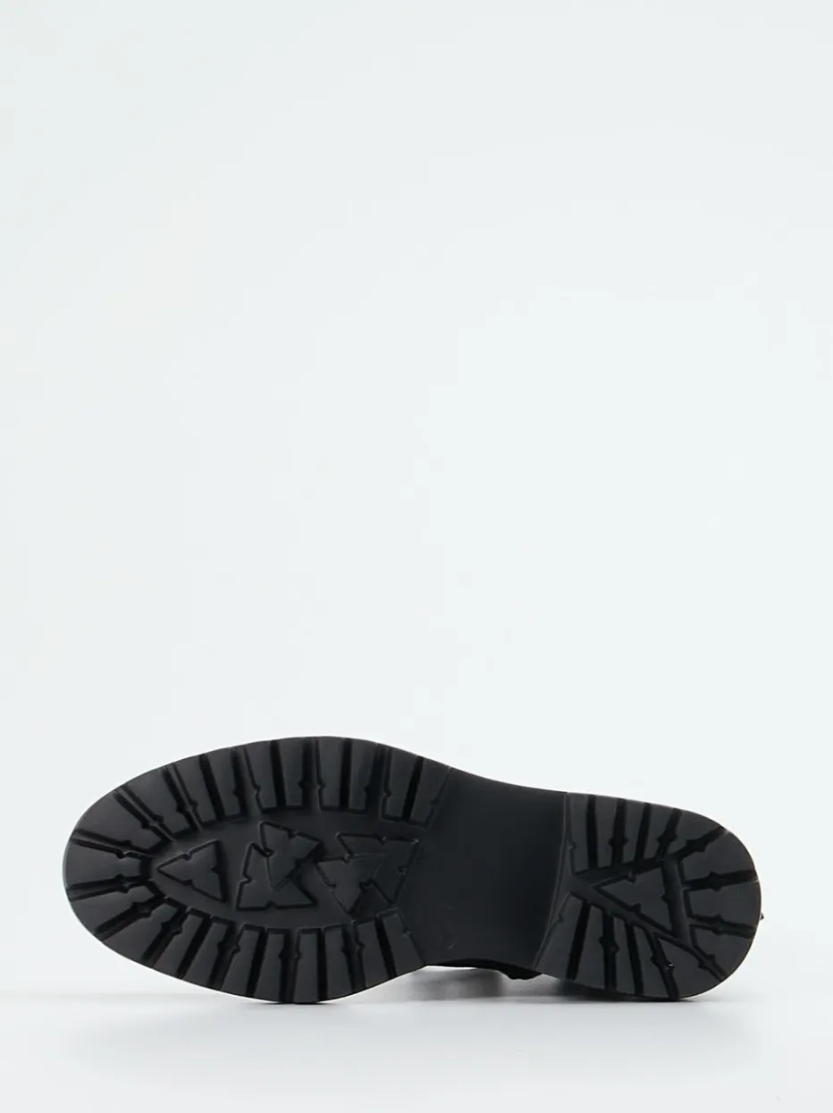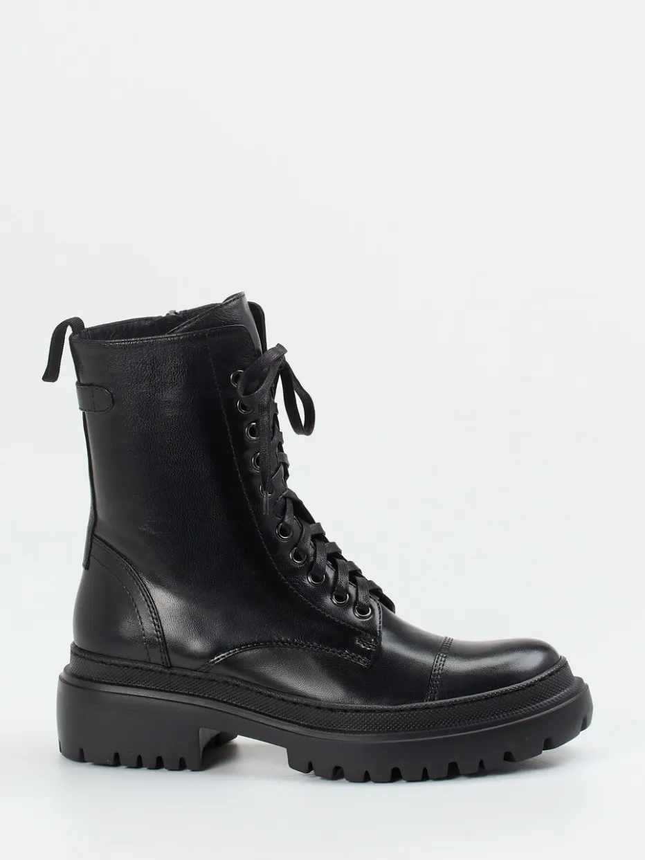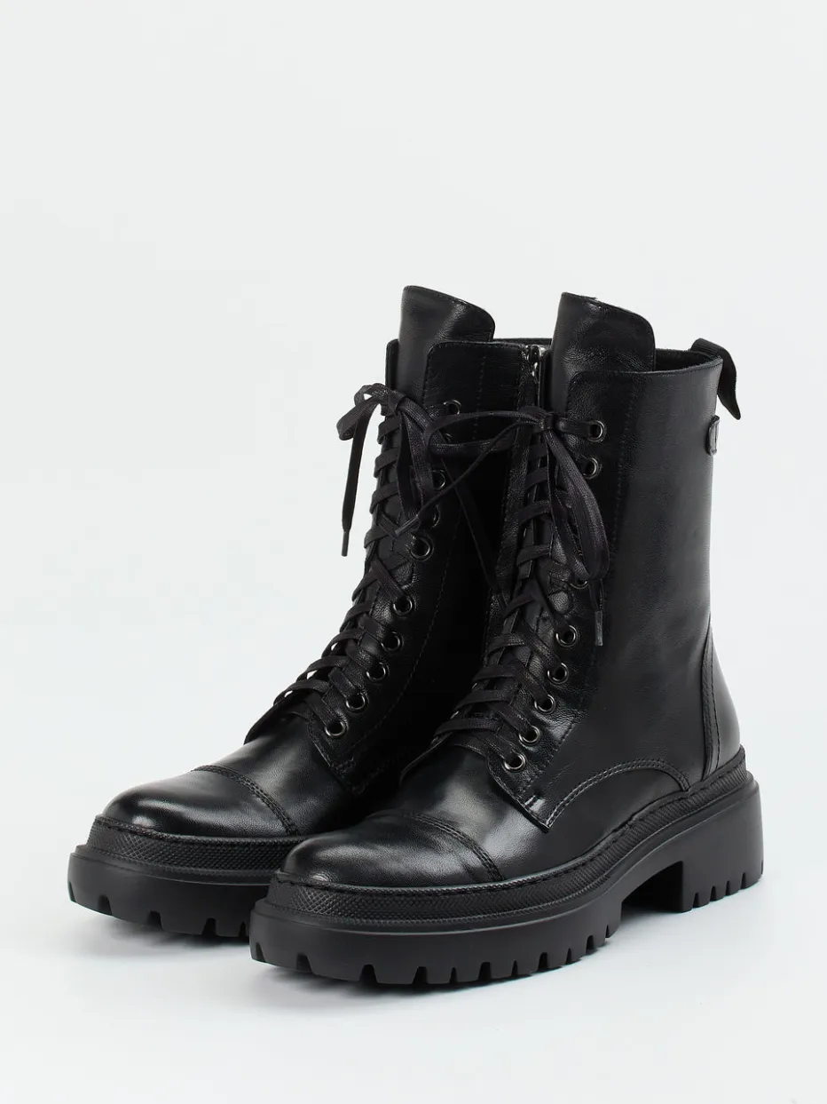 Funktion trifft Streetwear-Charakter.Konstantin Starke präsentiert eine Schnürstiefelette, die zeitlose Stabilität mit aktuellen Designcodes vereint. Ideal für stylische Alltagswege und lange Abende im urbanen Umfeld – das schwarze, handschuhweiche Lammleder mit glänzender Oberfläche und Ton-in-Ton-Nähten unterstreicht die hochwertige Verarbeitung. Der knöchelhohe Combat-Style mit markanter Profilgummisohle, schwarzem Reißverschluss und Metallösen trifft den Trend zu Chunky Soles und Neo-Utility. Die Kombination aus Schnürung und Innenreißverschluss sorgt für optimalen Komfort und einfaches Handling. Ein starkes Statement für moderne Looks mit Anspruch an Funktionalität und Qualität.