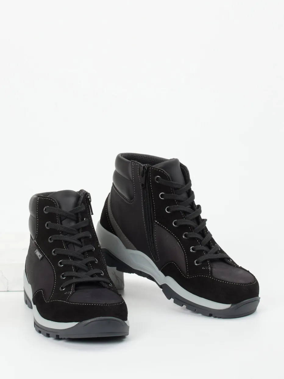 Für aktiven Komfort bei jedem Wetter.Finn Comfort präsentiert mit dieser Schnürstiefelette ein knöchelhohes Modell für Outdoor und Alltag. Das robuste Nubukleder wird an ausgewählten Partien durch samtig-mattes Veloursleder ergänzt – kombiniert mit Textilfutter, synthetischen Besätzen und Kontrastnähten entsteht ein moderner Utility-Look in Tiefschwarz. Der gepolsterte Schaft und ein seitlicher Reißverschluss bieten Komfort beim Tragen und Anziehen. Die profilierte Gummisohle mit Shock Absorber sorgt für Halt auf wechselndem Terrain, ein herausnehmbares Korkfußbett ermöglicht individuelle Anpassung. Inspiriert von Gorpcore und Streetstyle, harmoniert der Look mit Freizeitjacke und Funktionshose. Ein funktionaler Wohlfühlschuh mit hochwertiger Ausstattung von Finn Comfort.