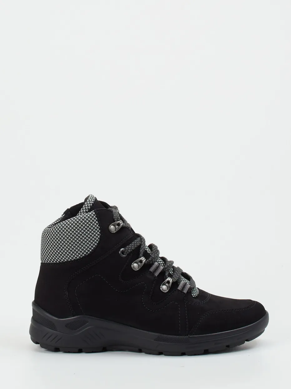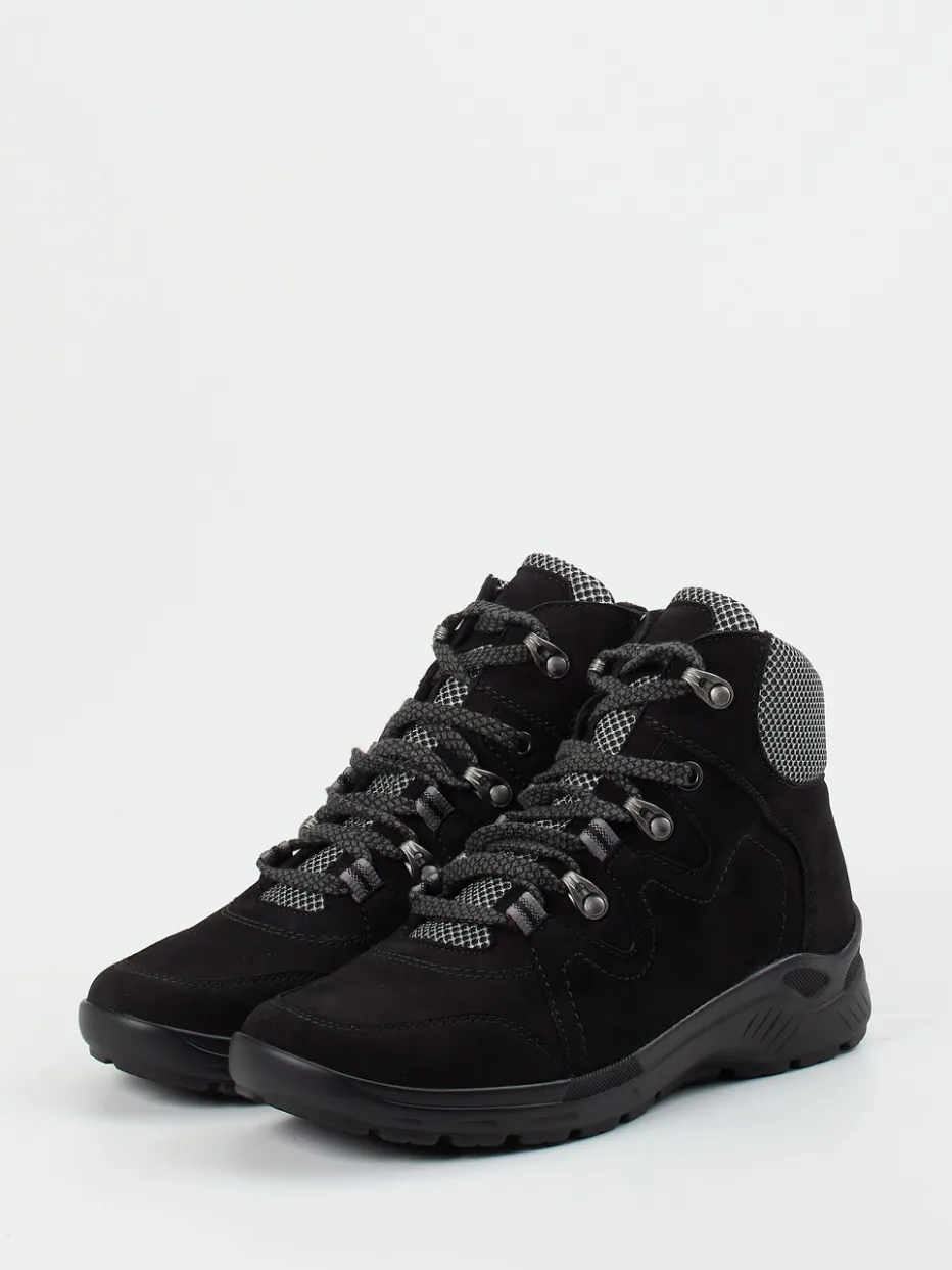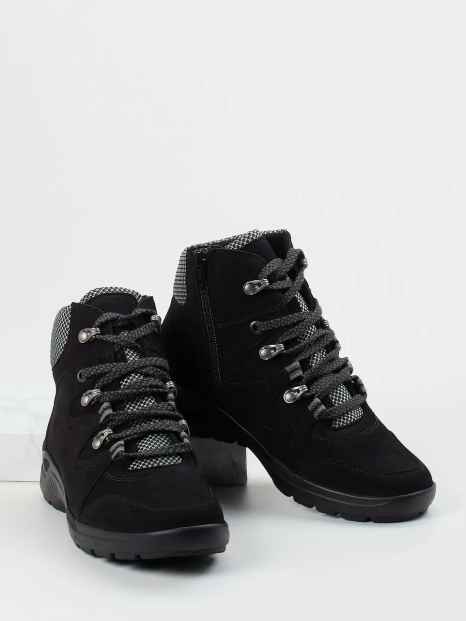 Komfort trifft Outdoor-Design.Die Marke Semler präsentiert eine knöchelhohe Schnürstiefelette für Damen – ideal für Alltag und leichte Wanderungen. Wenn bewegungsintensive Tage nach Halt und Komfort verlangen, überzeugt dieses Modell mit einem Mix aus samtig angeschliffenem Nubukleder und strukturgebendem Mesh in Strick-Optik. Das Design zeigt sich in tiefem Schwarz mit dunkelgrauen Kontrasten und wird durch Metallösen und Zweifarbenschnürung akzentuiert. Ein seitlicher Reißverschluss erleichtert das Anziehen, während Vario-Fußbett und profilierte PU-Sohle für Gelenkschonung und Trittsicherheit sorgen. Die Silhouette mit gepolstertem Schaft stützt den Knöchel und folgt aktuellen Gorpcore-Impulsen. Ein verlässlicher Stilpartner für Komfortliebhaber mit Anspruch an zeitgemäßes Outdoor-Flair.