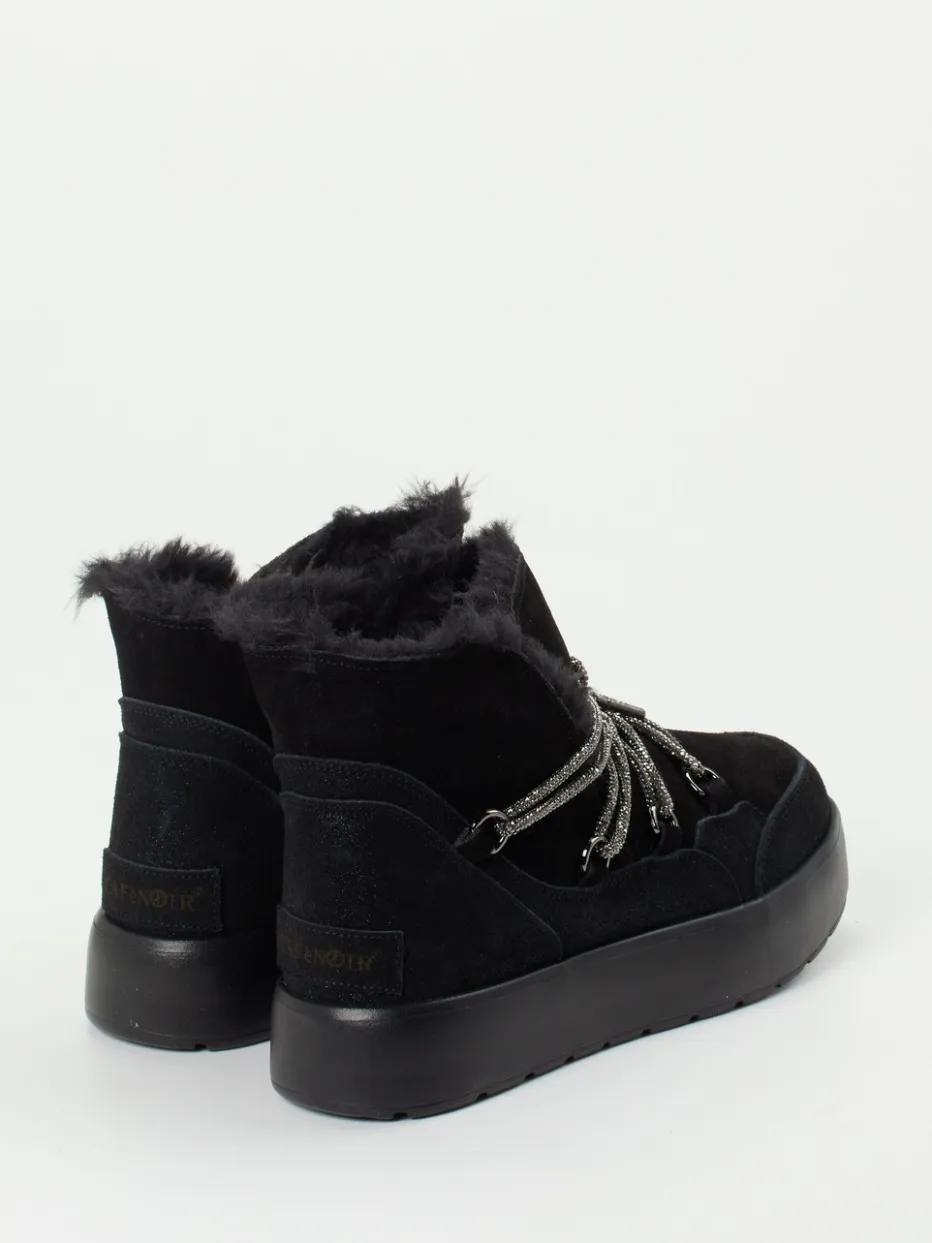 Winter-Style mit Utility-Charme.CAFèNOIR kreiert mit dieser Schnürstiefelette ein ausdrucksstarkes Damenmodell für die kalte Jahreszeit. Ideal geeignet für frostige City-Spaziergänge oder entspannte Alltagsszenarien, punktet der Schuh mit weichem Veloursleder in tiefem Schwarz – samtig angeschliffen – und dekorativer Schnürung mit anthrazitfarbenen Glanzdetails. Ein sichtbarer Kunstfellbesatz am Schaft sowie das warme Futter aus Textilfaser sichern ein kuscheliges Tragegefühl. Die kompakte Form mit rutschhemmender Gummiprofilsohle verleiht funktionale Stabilität, während die metallischen Ösen und das urbane Finish Trends wie „Winter Utility“ reflektieren. Optimal kombinierbar zu Thermoleggings und Oversize-Coat. CAFèNOIR verbindet modische Extravaganz mit wohldosierter Funktionalität.