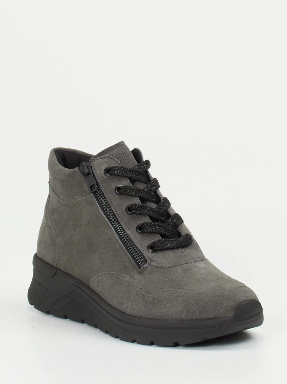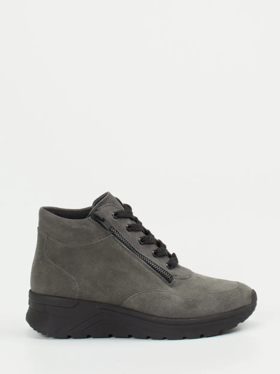 Alltagsschuhe mit Stilfaktor.Solidus präsentiert eine komfortorientierte Schnürstiefelette für Damen. Ideal für ausgedehnte Tage unterwegs oder gemütliche Stunden zu Hause bietet das Modell praktische Details, wie einen seitlichen Reißverschluss für leichten Einstieg. Gefertigt aus grauem Veloursleder mit matter Oberfläche, wirkt das Design durch knöchelhohe Silhouette und glitzernde Schnürsenkel modern und urban. Die gepolsterte Gummisohle mit Dämpfungseffekt überzeugt auf langen Wegen, während Baumwollfutter und Wechselfußbett für zusätzlichen Komfort sorgen. Die schwarz abgesetzte Sohle verleiht dem Look eine sportliche Note und ergänzt Streetwear-inspirierte Outfits harmonisch. Solidus verbindet orthopädischen Komfort mit dezenten Designimpulsen.
