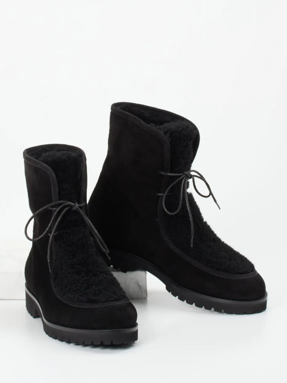 Understatement in stilvoller Winterform.Unützer präsentiert eine klassische Schnürstiefelette für Damen. Ob beim Stadtbummel oder auf dem Weg ins Lieblingscafé: Diese Stiefelette erfüllt den Anspruch an Wärme, Komfort und dezente Eleganz. Gefertigt aus hochwertigem Veloursleder mit samtiger Oberfläche und gefüttert mit echtem Lammfell, bietet sie angenehme Wärme an kalten Tagen. Die schwarze Farbe, tonige Nähte und die subtil sichtbare Teddyfell-Zunge verleihen ihr eine zurückhaltend luxuriöse Ausstrahlung. Die robuste Gummisohle mit markantem Profil verspricht sicheren Halt bei winterlichen Bedingungen. Minimalistische Gorpcore-Anklänge treffen auf tägliche Funktionalität. Unützer verbindet feine Handwerkskunst mit tragbarem Luxus für anspruchsvolle Winter-Outfits.
