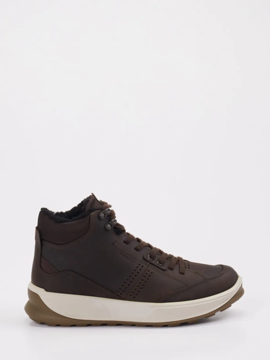 Stilsicher unterwegs bei Wind und Wetter.Ecco zeigt mit diesen Herren-Schnürstiefeletten ein durchdachtes Outdoor-Design mit Streetwear-Charakter. Für den Einsatz zwischen Stadt und Natur entwickelt, bietet das Modell wetterfestes Nubukleder, das samtig angeschliffen ist. Die dunkelbraune Oberfläche mit tonalen Ziernähten trifft auf karamellfarbene Akzente und eine voluminöse, griffige Gummisohle. Gunmetal-Ösen und ein gepolsterter Textilschaft ergänzen den Look ebenso wie das warme Textilfutter. Funktionalität und Trendbewusstsein vereinen sich in einer Silhouette, die sowohl zur Thermohose als auch zur Cargopants passt. Ecco verbindet Komfortkompetenz mit moderner Utility-Ästhetik.