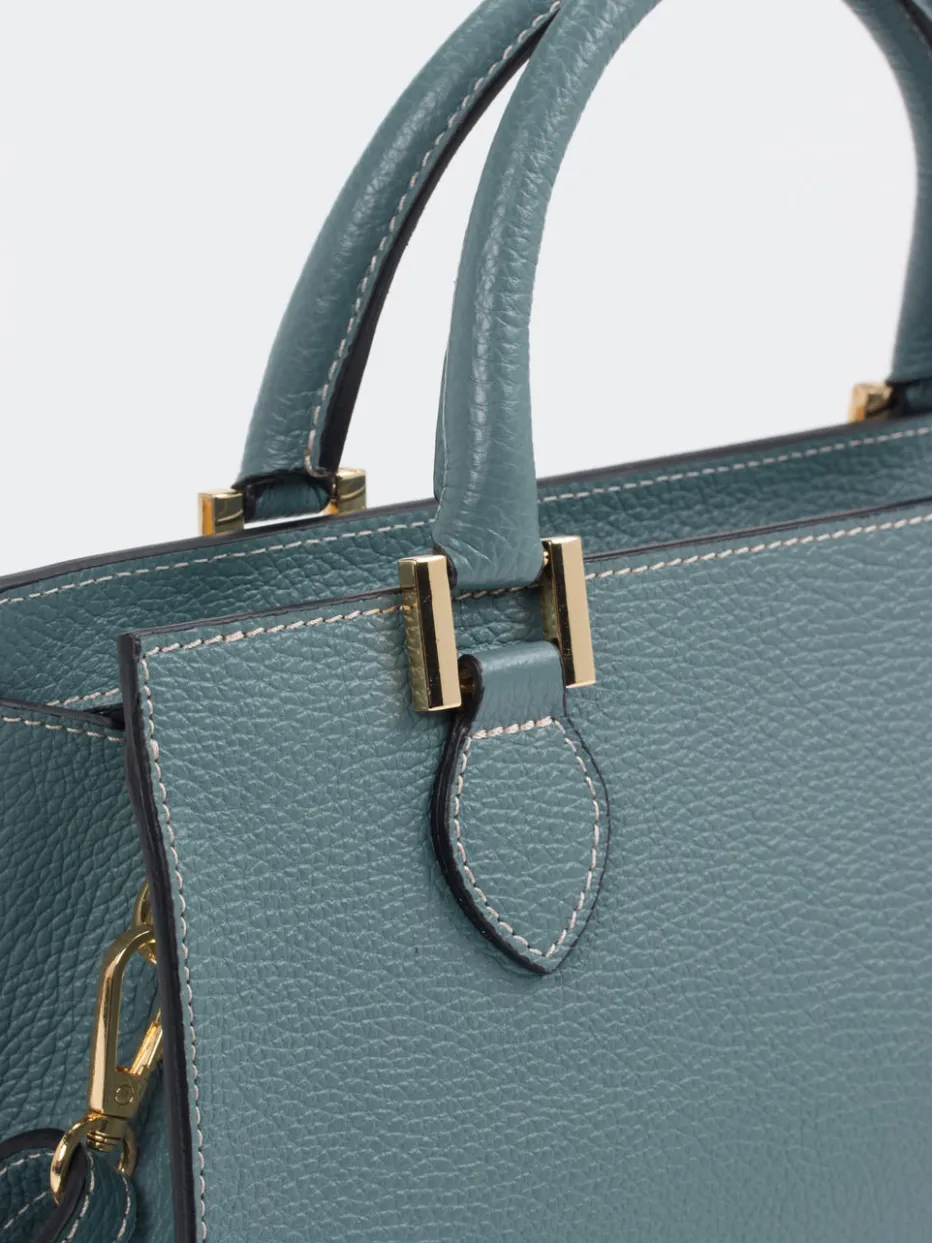Strukturiertes Kalbleder, goldfarbene Details und klare Silhouette verleihen diesem Modell einen modernen, reduzierten Charakter mit hochwertiger Anmutung.