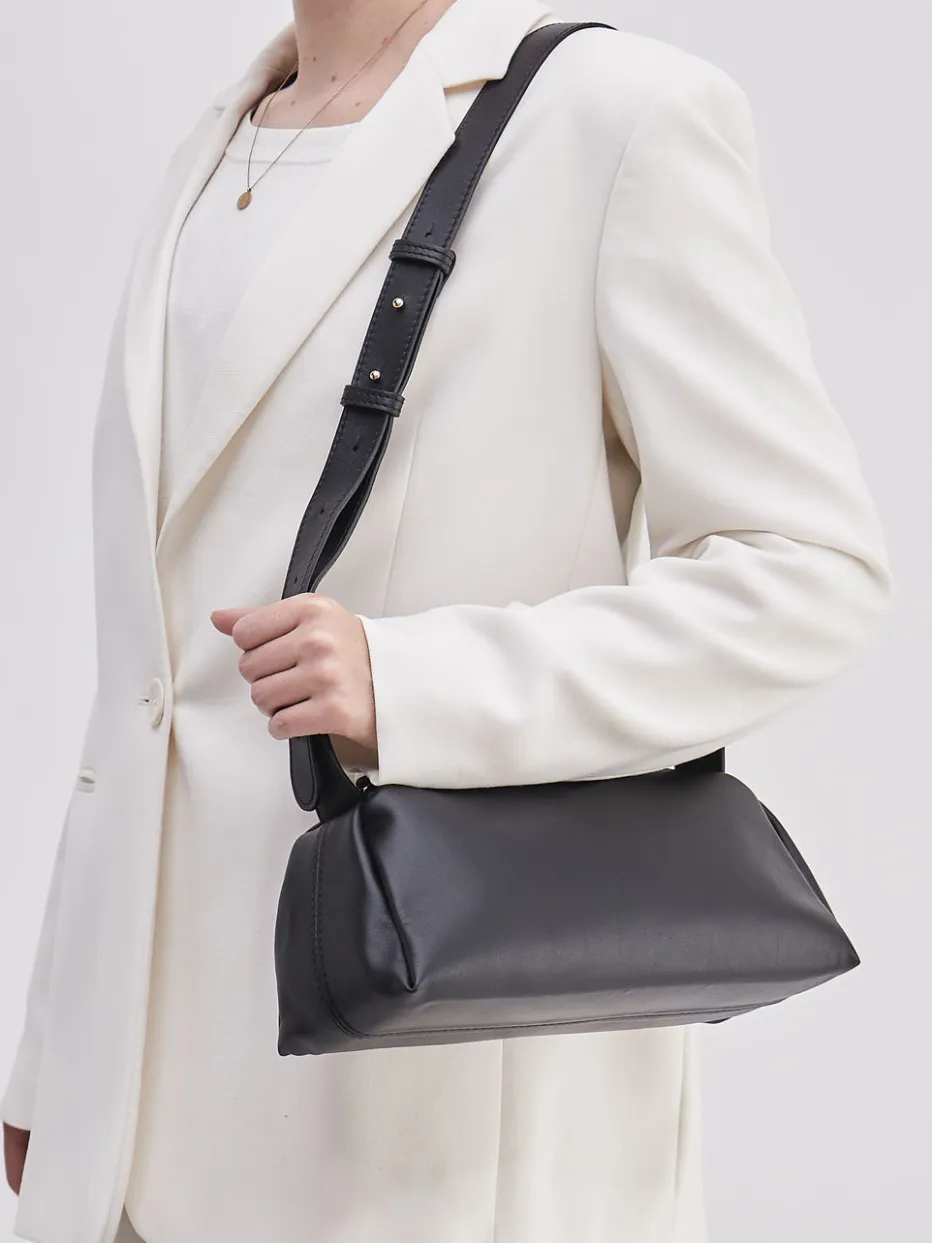 Stilvolle Zurückhaltung für jeden Tag. Konstantin Starke präsentiert mit dieser Schultertasche eine moderne Baguette Bag für den urbanen Alltag. In Situationen zwischen Meeting und Freizeit setzt das Modell mit seinem tiefschwarzen Lammleder auf zeitlose Klasse. Die matte Oberfläche, rechteckige Silhouette und goldfarbene Hardware verleihen dem Design eine dezente Eleganz. Ein verstellbarer Schulterriemen und der Reißverschluss mit Zuglasche runden die funktionale Seite ab. Inspiriert von „Quiet Luxury“ und minimalistischer Streetwear-Ästhetik ist sie ein flexibler Begleiter für Capsule Wardrobes. Ideal kombinierbar mit Trenchcoats oder Chunky Loafern. Ein Qualitätsaccessoire mit ruhiger Aussage und urbanem Chic.