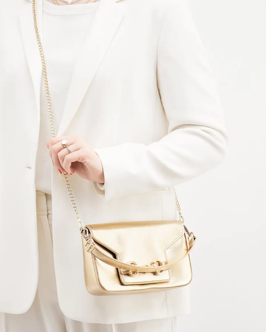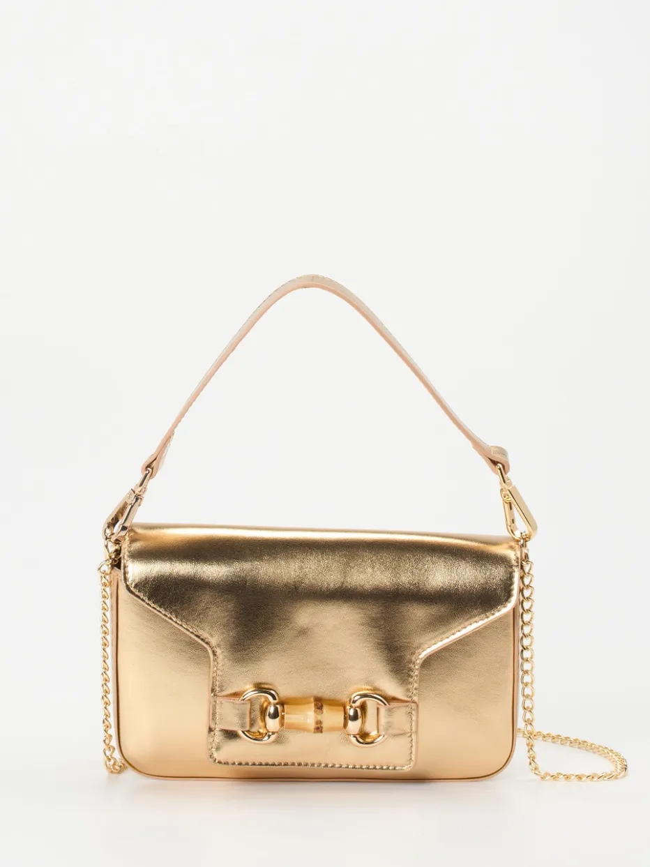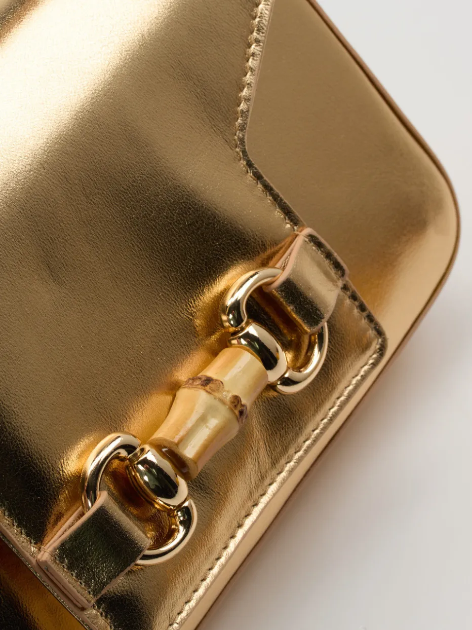Diese Mini Bag von Konstantin Starke kombiniert edlen Metallicglanz mit einem stilvollen Bambusdetail – ein elegantes Accessoire mit subtiler Vintage-Note.