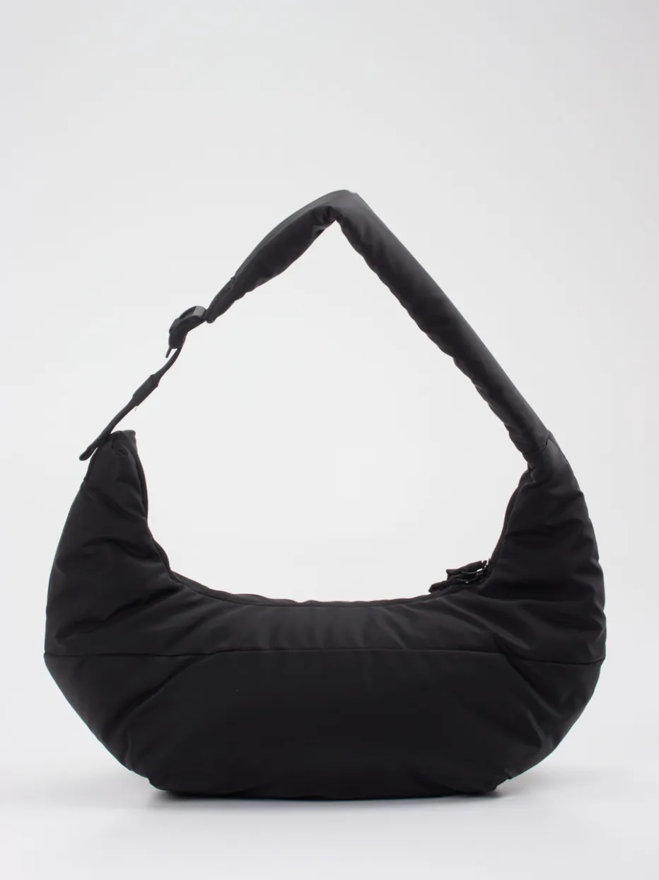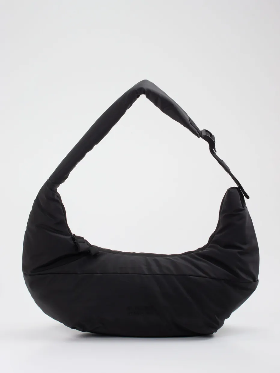 Die gepolsterte Hobo Bag aus mattem Synthetikmaterial verbindet urbanen Komfort mit minimalistischer Funktionalität – ideal für einen reduzierten Alltagslook.