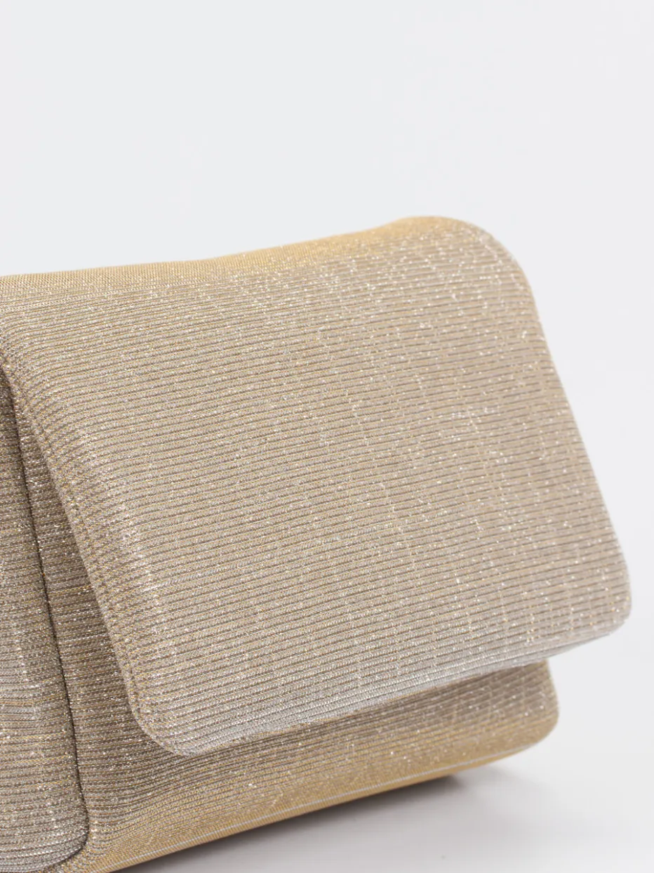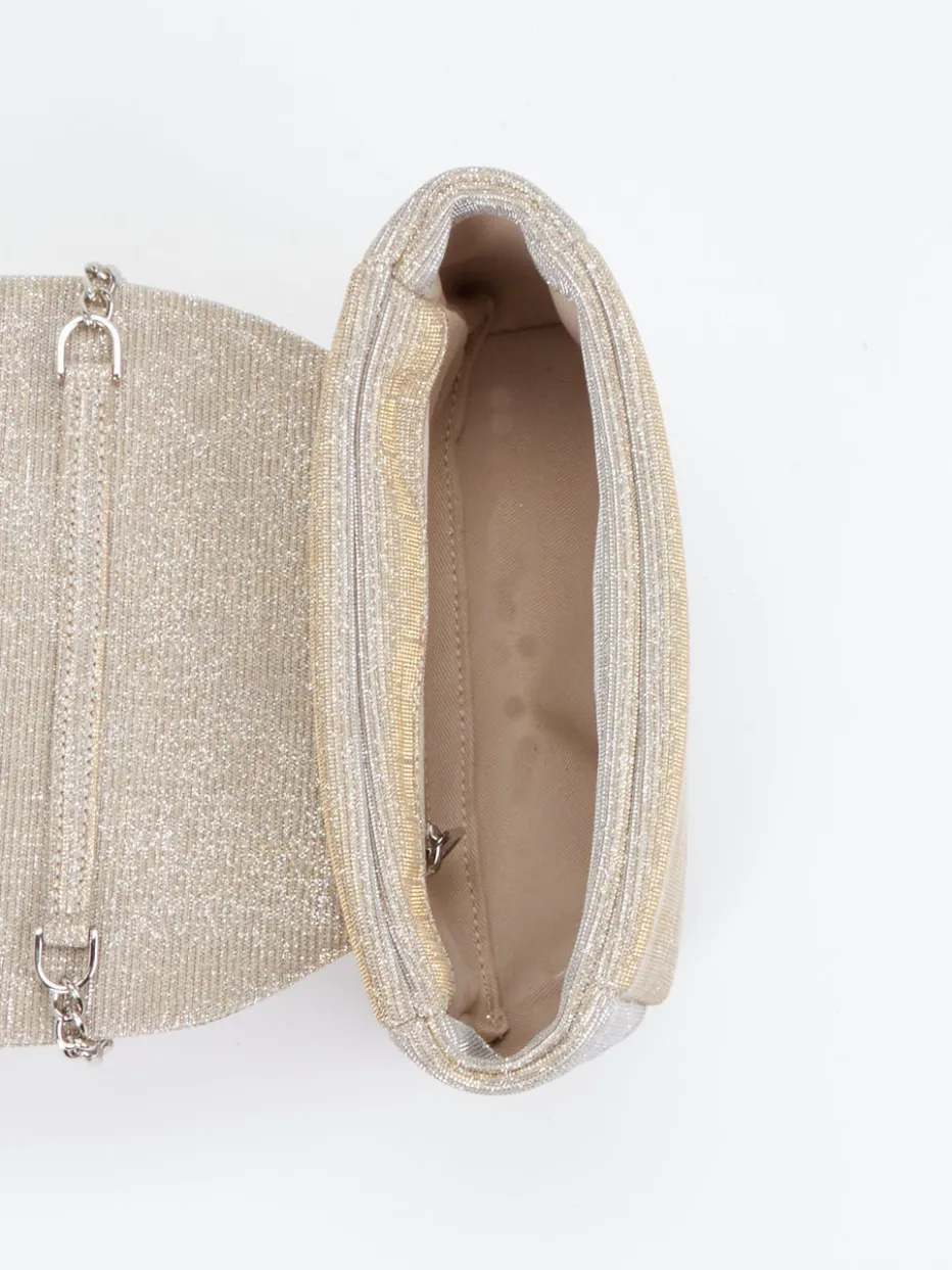 Diese Mini-Bag verbindet glitzernde Textilstruktur mit metallischem Kettendesign – ein stilvolles Accessoire für besondere Anlässe.